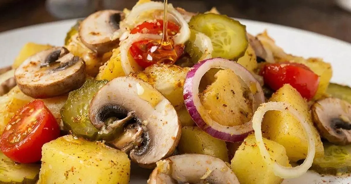 Возьмите большую салатницу. В неё переложите тёплый запечённый картофель, остывшие грибы, корнишоны, помидоры и лук. Полейте всё приготовленным медово-горчичным соусом.