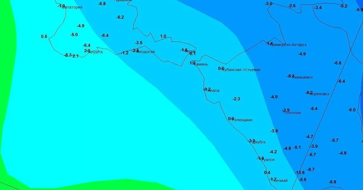 Мощное похолодание, которое накрыло европейскую часть России, добралось до побережья Черного моря в Краснодарском крае и Крыму. Температуры на курортах рухнули до отрицательных значений. Об этом 14 декабря сообщил в своем телеграм-канале ведущий синоптик центра погоды «Фобос» Михаил Леус.