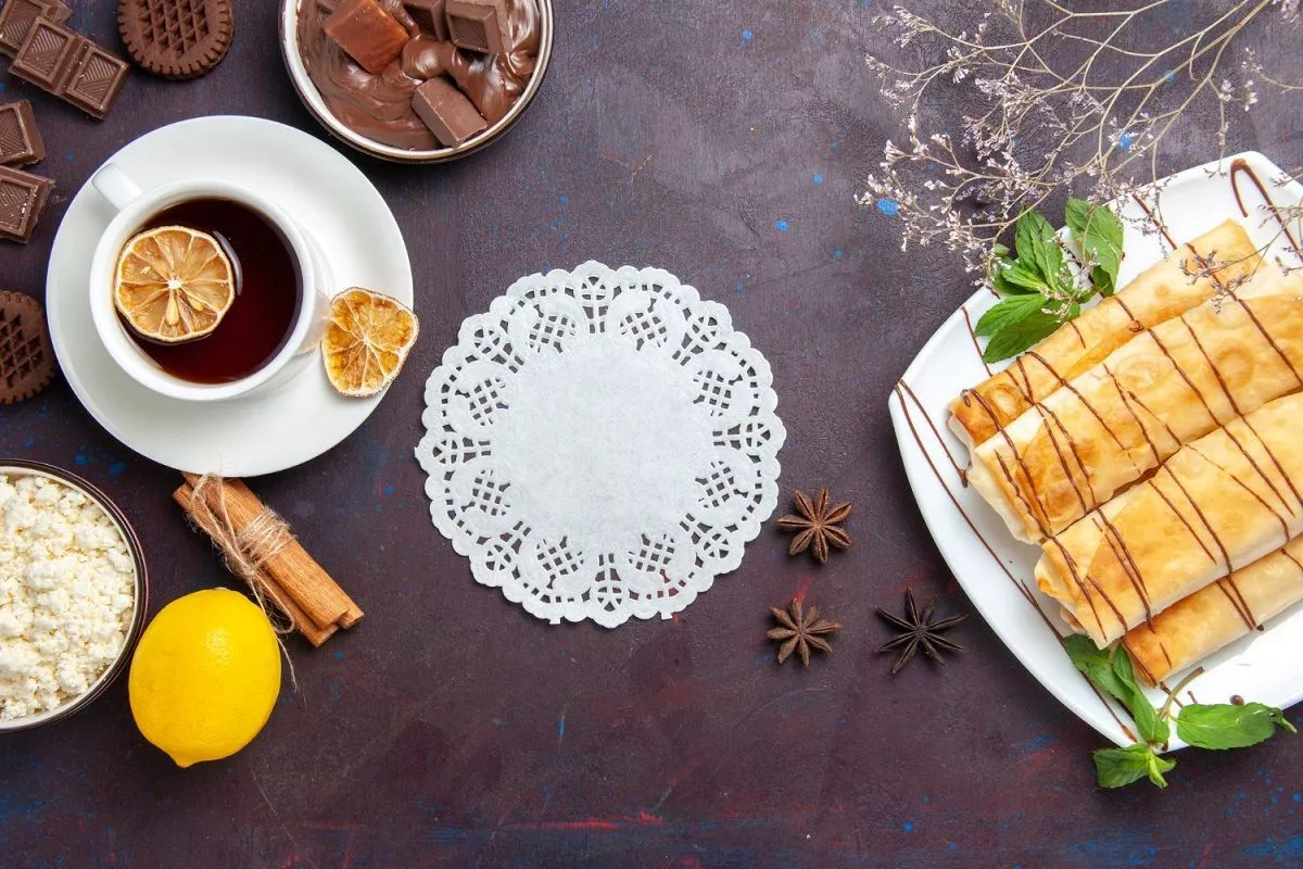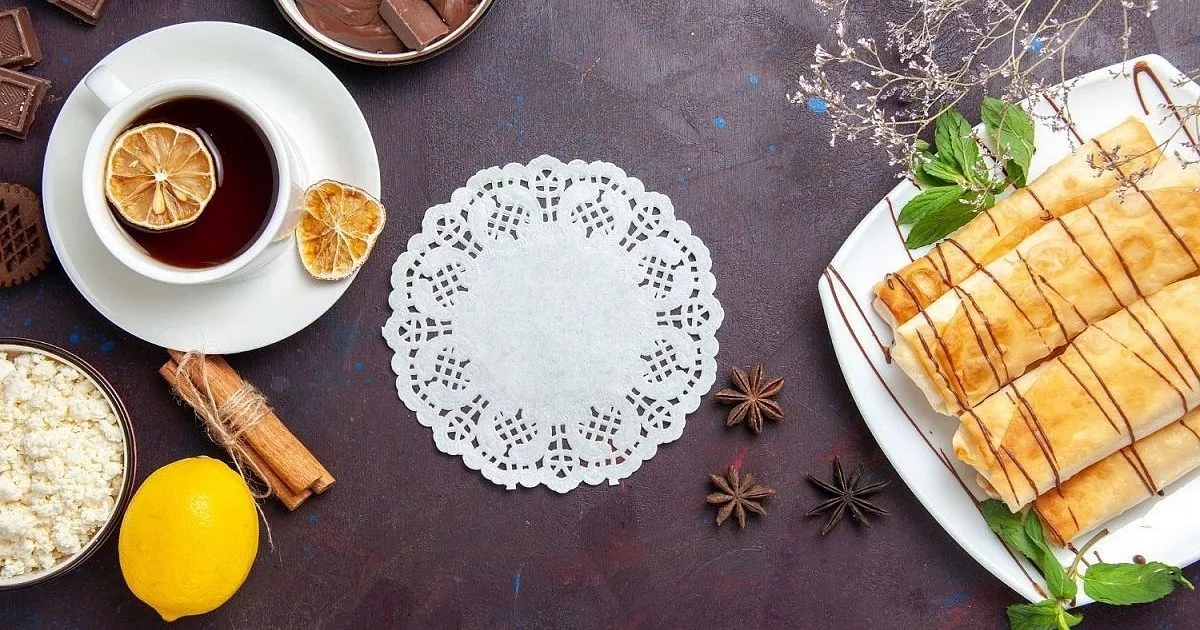 Ингредиенты: лаваш тонкий армянский — 2 листа, творог мягкий жирностью 5% — 200 г, сливочный сыр — 100 г, сгущенное молоко вареное — 3 ст. л., какао-порошок натуральный — 1 ч. л., мед жидкий — 1 ст. л., орехи грецкие измельченные — 50 г, ягоды свежие или замороженные (например, клубника, малина) — 100 г, кокосовая стружка мелкая — 2 ст. л., корица молотая — щепотка, ванильный экстракт — ½ ч. л.