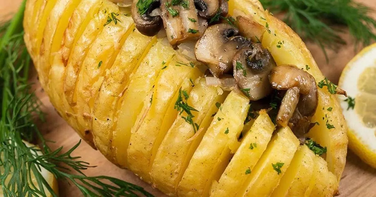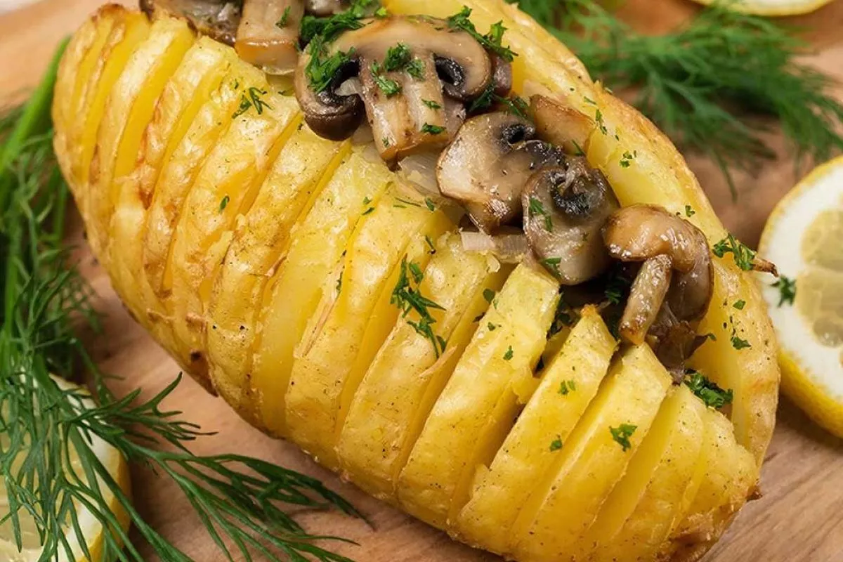 Картофель тщательно моют и делают поперечные надрезы, оставляя немного места у основания. В каждый надрез добавляют кусочки сливочного масла. Грибы и лук мелко нарезают и обжаривают до золотистого цвета, затем аккуратно распределяют начинку между ломтиками картофеля.