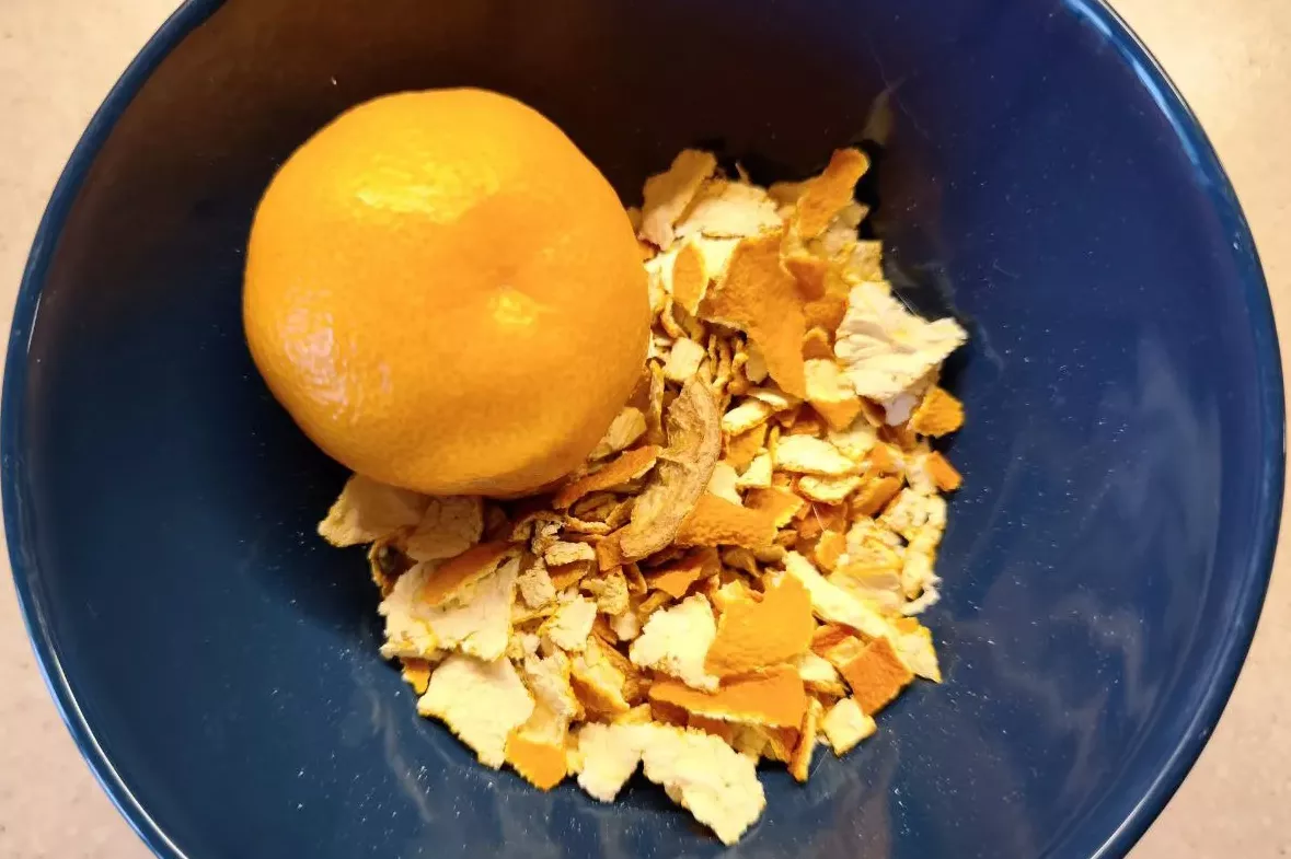 Соберите мандариновые, апельсиновые корки или от других цитрусовых. Промойте, обсушите на батарее или в духовке (40–50 градусов, 2–4 часа) до появления хруста. Измельчите ножницами или кофемолкой в крошку. Храните в картонной коробке до 6 месяцев в сухом месте.