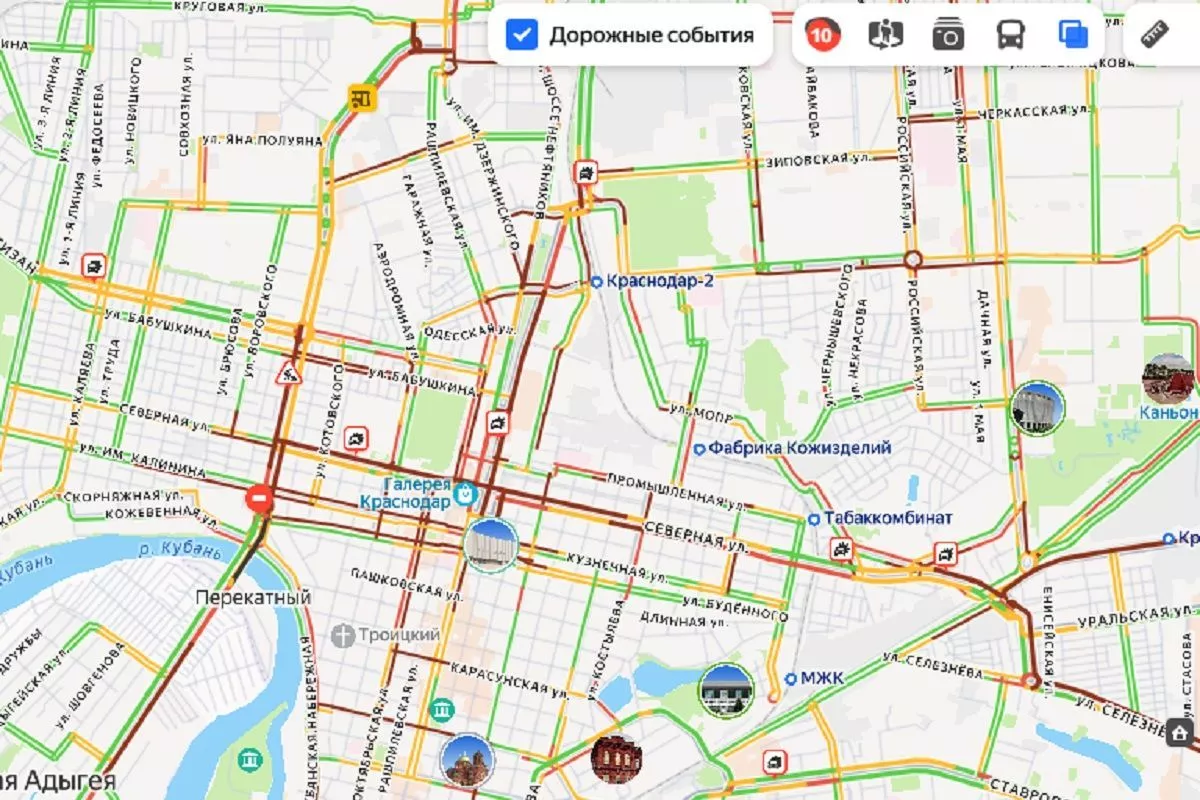 По традиции в бордовый цвет окрасились улицы в центре кубанской столицы – стоят Красная, Рашпилевская, Коммунаров, Хакурате, Одесская. Пробки образовались улице Северной, Промышленной, Кузнечной, Костылева, Янковского, Седина и других. Тургенева стоит от Гагарина в направлении моста. Также затор наблюдается перед Яблоновским мостом.