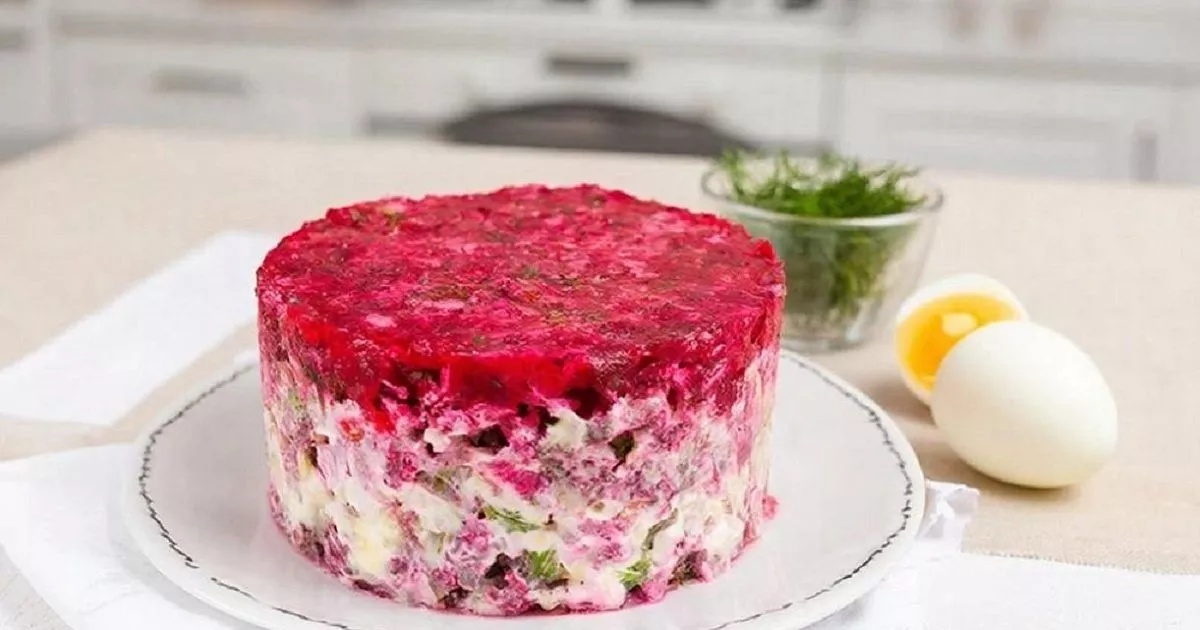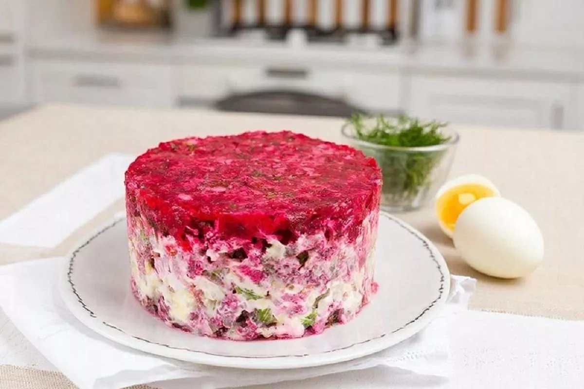 Ингредиенты: копченая скумбрия — 2 шт., картофель вареный — 3 шт., морковь вареная — 2 шт., яйца отварные — 3 шт., лук репчатый — 1 головка, майонез — 200 г, соль — по вкусу, черный молотый перец — щепотка, свежая зелень укропа — небольшой пучок, сметана — 2 ст. л., чеснок — 1 зубчик, свекла вареная — 2 шт.