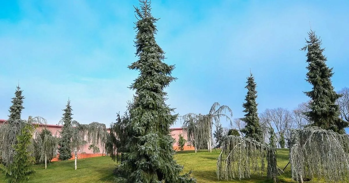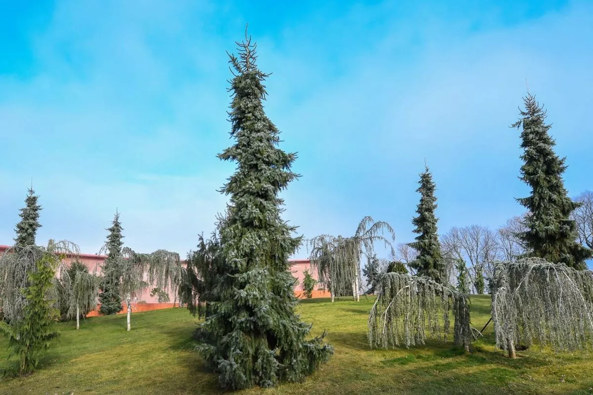 Экзотические растения - сербские ели, нутканский кипарисовик, атласский кедр - появились над каньоном.