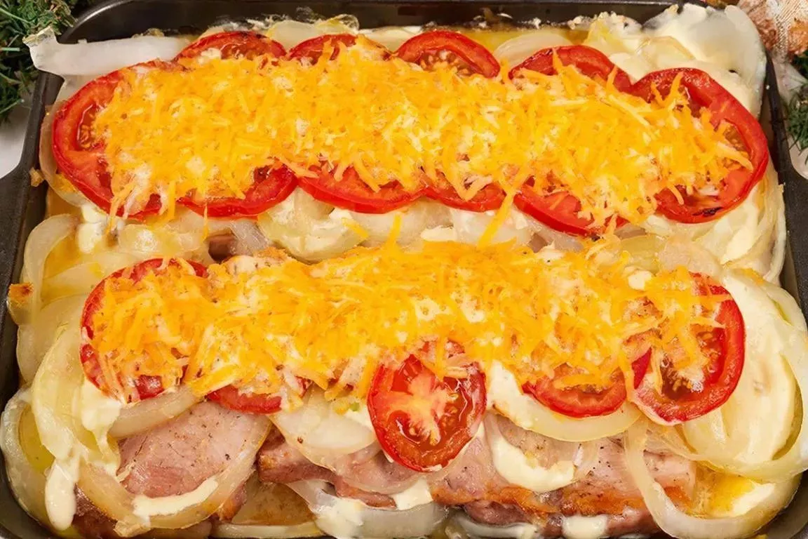 Для вариаций попробуйте добавить под слой помидоров немного шампиньонов. Или замените часть сметаны в маринаде на соевый соус. Сделайте мясо сочным, ярким и по-настоящему праздничным!