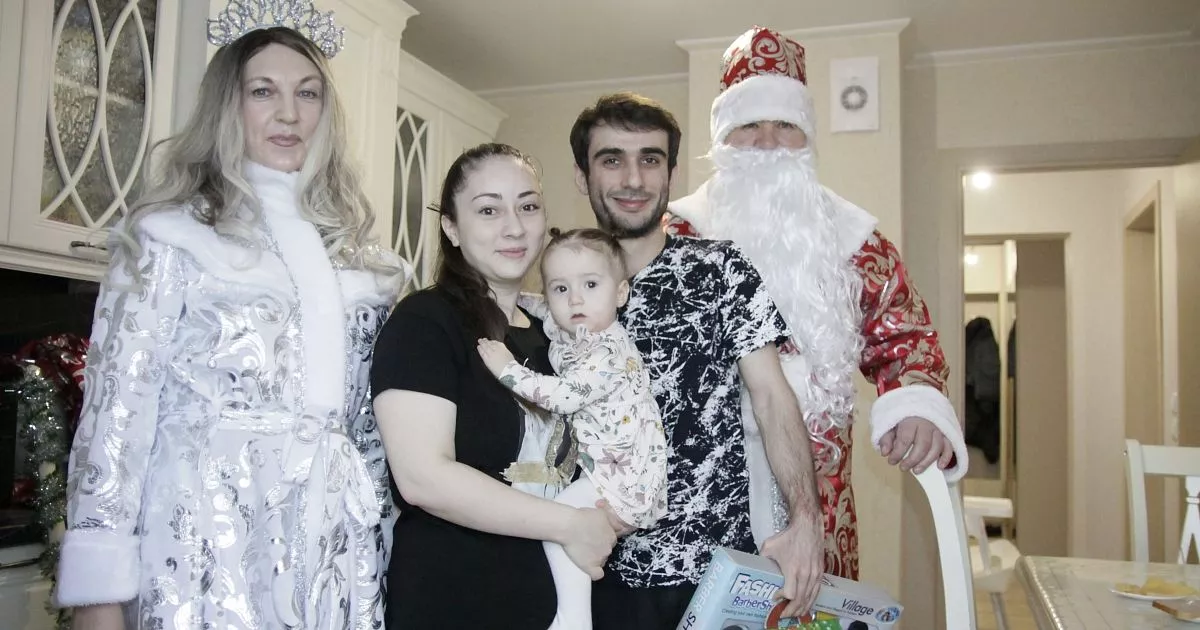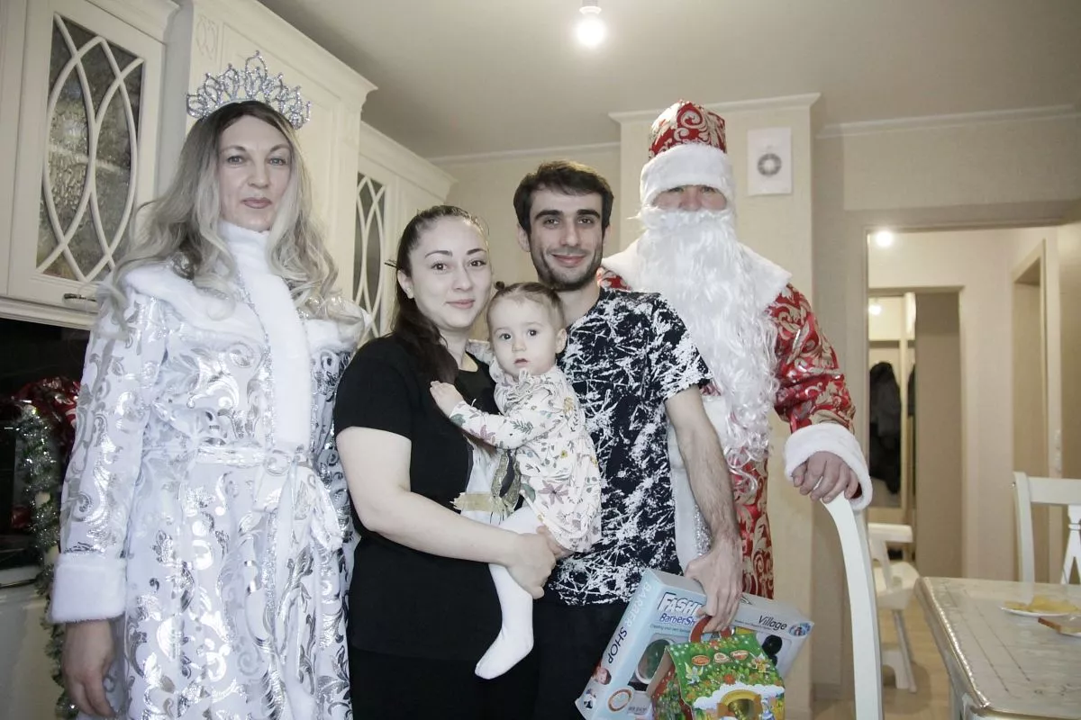 Дед Мороз и Снегурочка приготовили небольшое представление. Малышка Лейла, для которой это первый в жизни Новый год, во все глаза рассматривает необычных чародеев, да еще и с подарками.