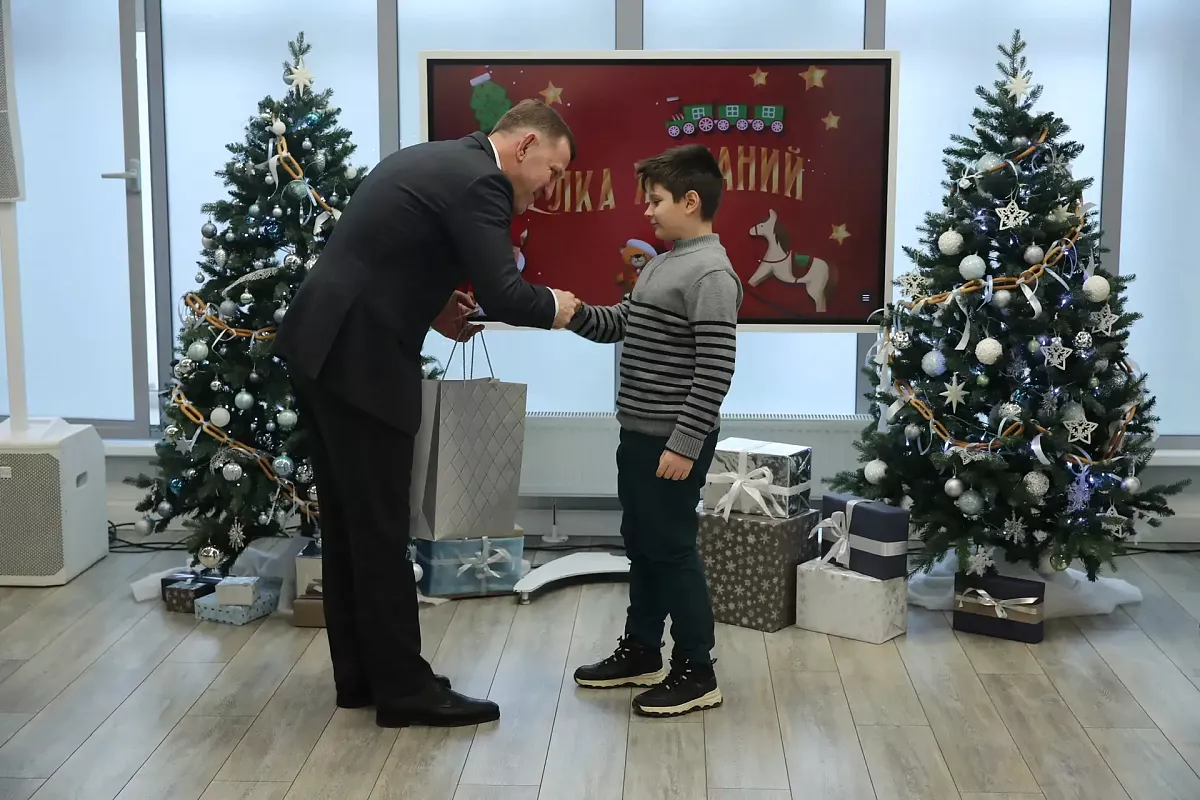 Торжественное мероприятие прошло в Муниципальном концертном зале. Вера Галушко вручила подарки трем братьям – пятилетнему Ратмиру и семилетнему Леониду самокат и велосипед с комплектами защиты, восьмилетнему Олегу — магнитный конструктор.
