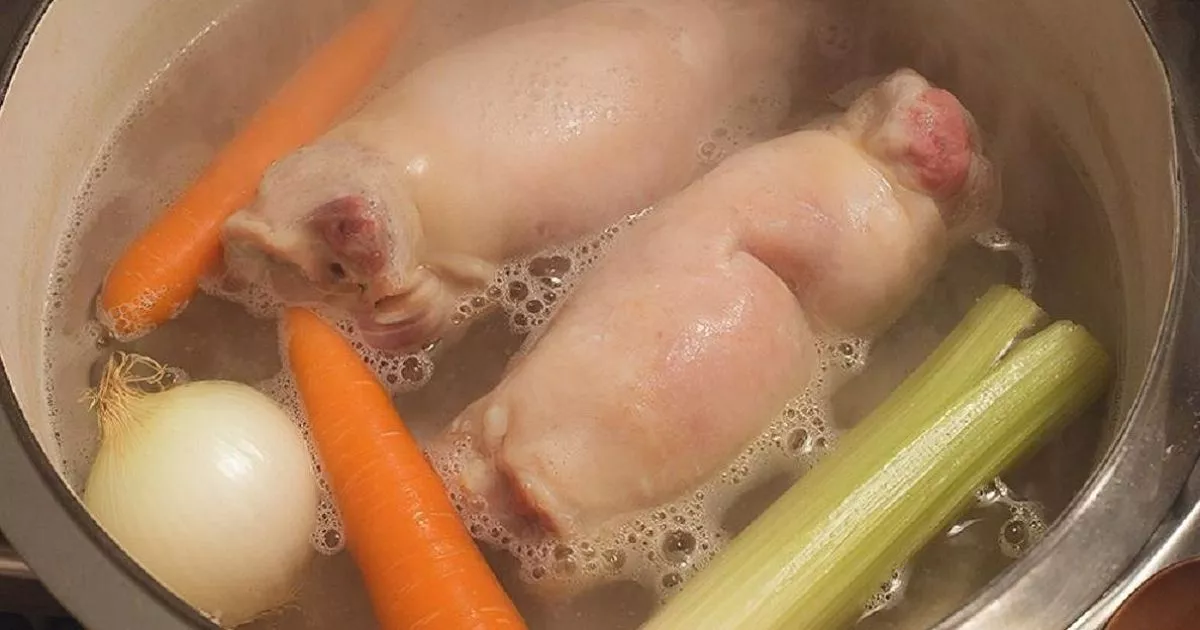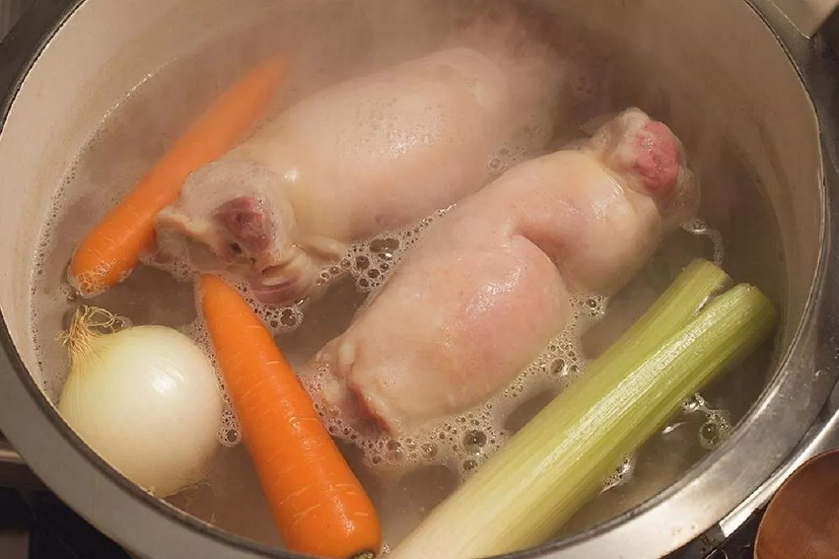 Тщательно промойте свиные ножки под проточной водой, удаляя загрязнения щеточкой. Поместите их вместе с говяжьими косточками в большую кастрюлю. Залейте мясо чистой холодной водой так, чтобы вода покрывала содержимое. Закипятите бульон, снимите пенку. Добавьте очищенную морковь целиком, репчатый лук, разрезанный пополам, лавровый лист, душистый и черный перец горошком. Затем уменьшите нагрев плиты до минимального, прикройте крышкой и пусть бульон кипит 6-8 часов. Чем дольше варится бульон, тем насыщеннее получится вкус и лучше застывание холодца.