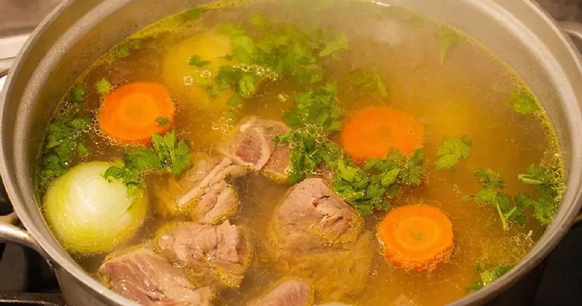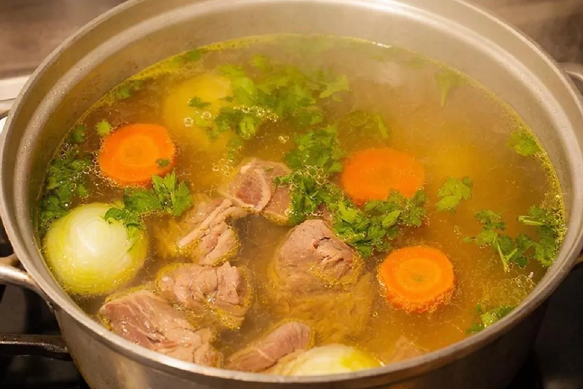 За час до окончания варки добавляем в бульон очищенную луковицу, морковь, черный перец горошком и лавровый лист. В самом конце варки солим бульон по вкусу. Иногда я добавляю корень сельдерея, мне кажется, что так бульон становится ароматнее и вкуснее.
