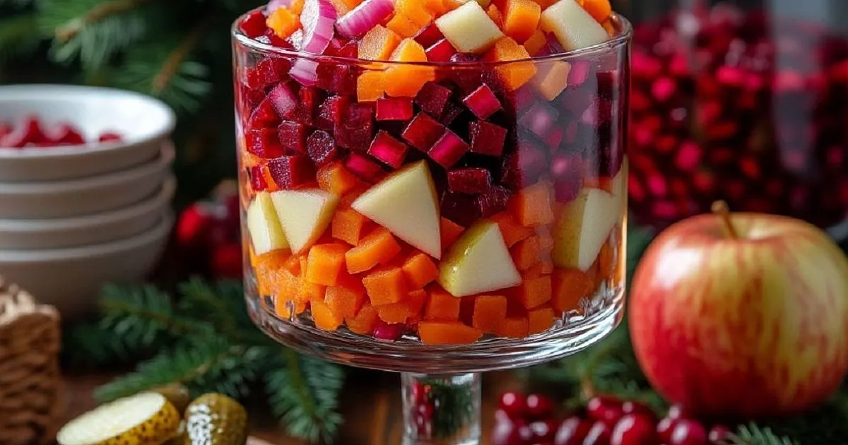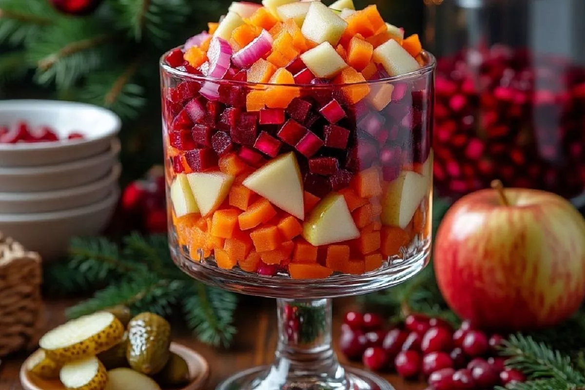 Новогодний салат винегрет с яблоком и виноградом получается легким, ароматным и немного летним.