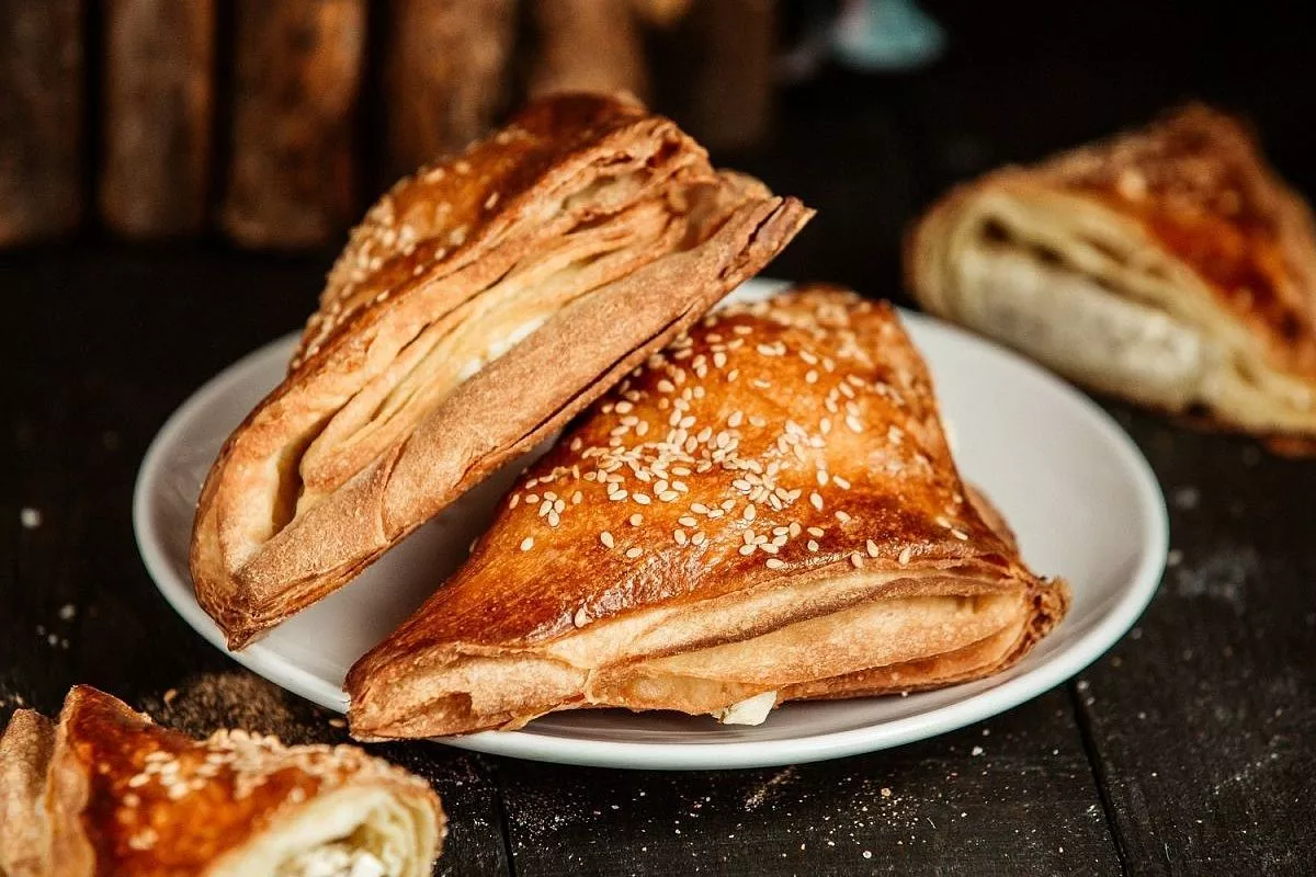 Слоеное бездрожжевое тесто — 500 г, сулугуни — 200 г, моцарелла - 150 г, яйцо куриное — 1 шт., масло сливочное — 20 г, зелень свежая (кинза, укроп) — небольшой пучок, соль, перец — по вкусу.