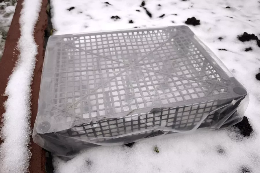 Для спасательной операции требуются 2 вещи: пластиковый ящик-решетка из-под овощей или фруктов (с отверстиями) и кусок прозрачной полиэтиленовой пленки. Это может быть старая плотная пакет-майка или часть упаковки. Из инструментов необходим всего лишь степлер.