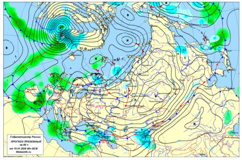 На большей части европейской территории России установится малооблачная и аномально морозная погода — температура воздуха будет на 4–9° ниже средних многолетних значений из-за усиления влияния континентального антициклона. В то же время на севере, северо-востоке и юге ЕТР, где действуют атмосферные фронты, местами ожидается снег, а на юге — мокрый снег, в отдельных районах сильный. Возможны гололедные явления, а при порывах ветра 13–18 м/с — метели; на юге ЕТР скорость ветра может достигать 20–25 м/с.