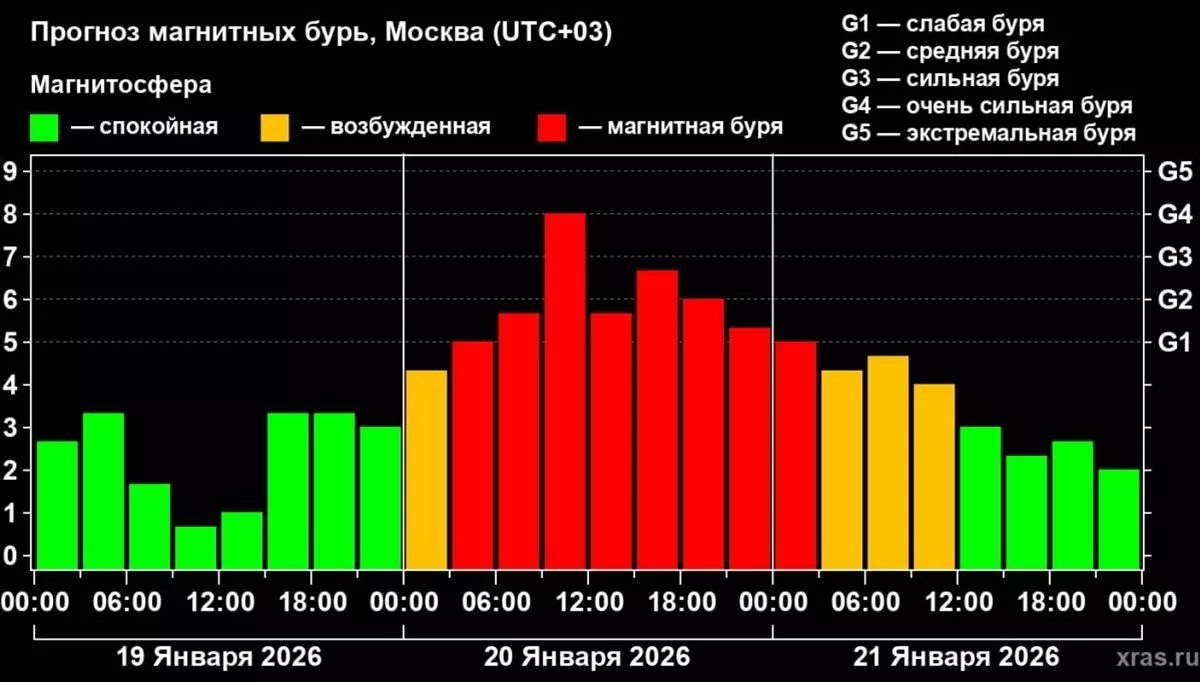 Уточняется, что международный прогностический центр заявил об ожидающейся магнитной буре, которая может превысить уровень G4.