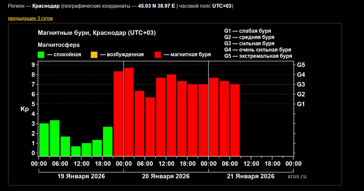 По данным на сайте Лаборатории солнечной астрономии ИКИ и ИСЗФ РАН, вероятность продолжения магнитной бури 21 января составляет 100%. В последующие дни ожидается снижение геомагнитной активности.
