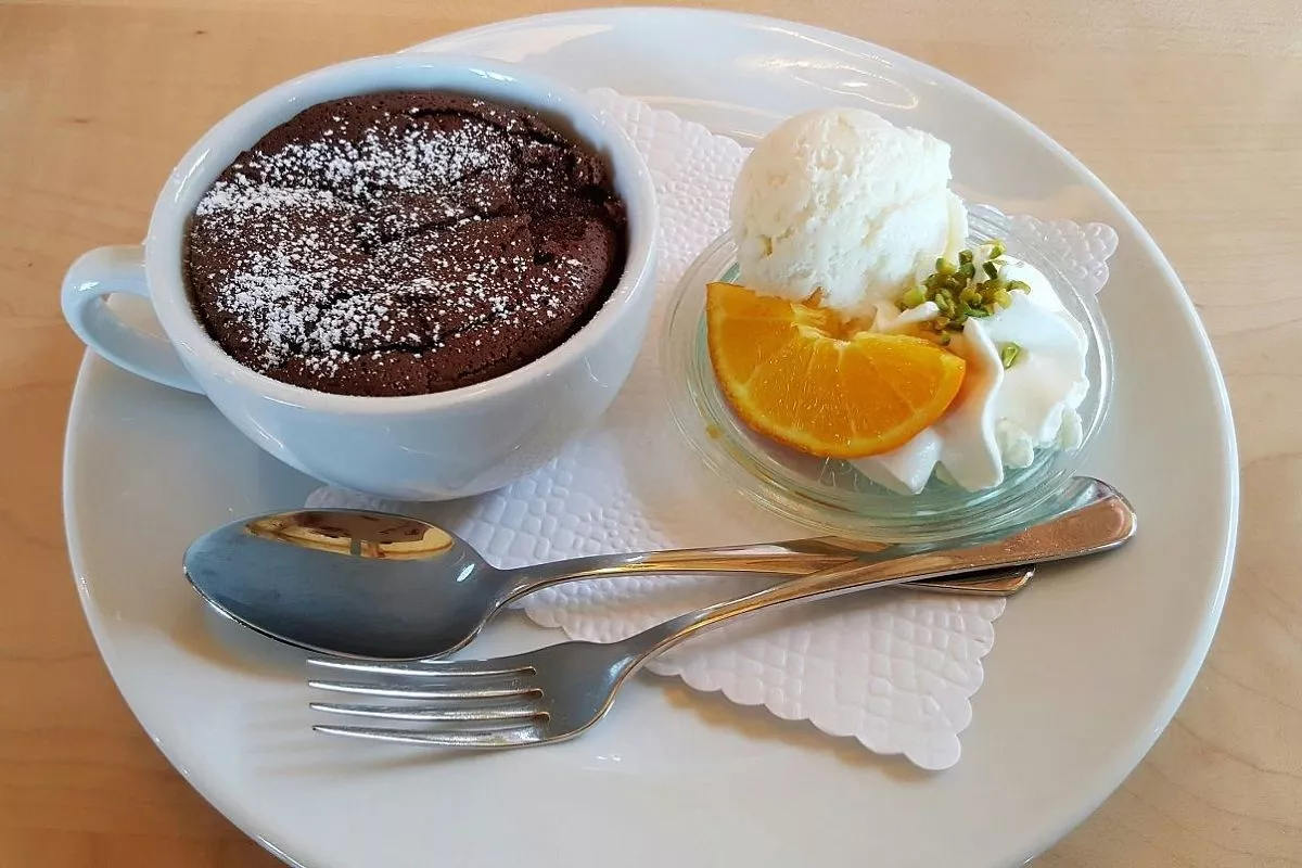 Получившийся шоколадный кекс щедро посыпьте сахарной пудрой или украсьте шариком мороженого. Вариантов украшения масса - выбирайте тот, что вам кажется более красивым и вкусным. Приятного аппетита!