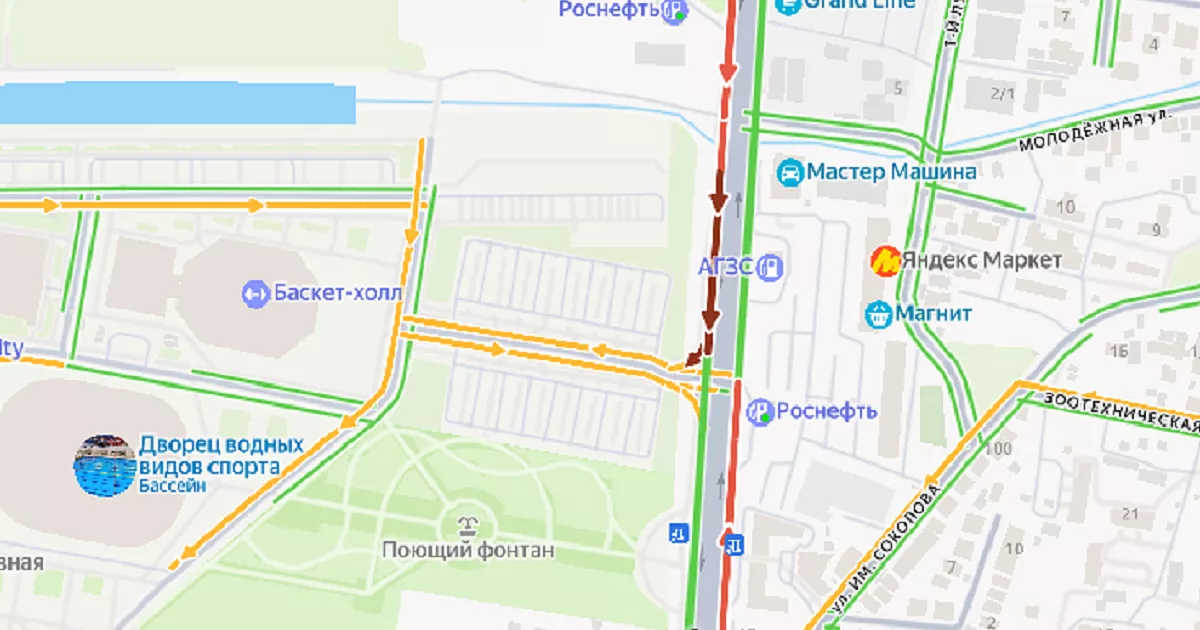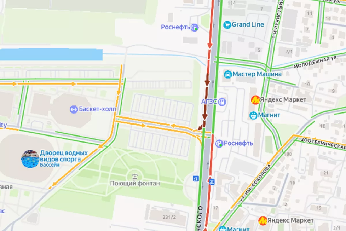 По данным «Яндекс.Пробки», затор протяженностью более 5 км растянулся в сторону «Баскет-холла» от улицы Стахановской. Пробка более 1,5 км наблюдается к «Баскет-холлу» от 4-го Пригородного проезда.