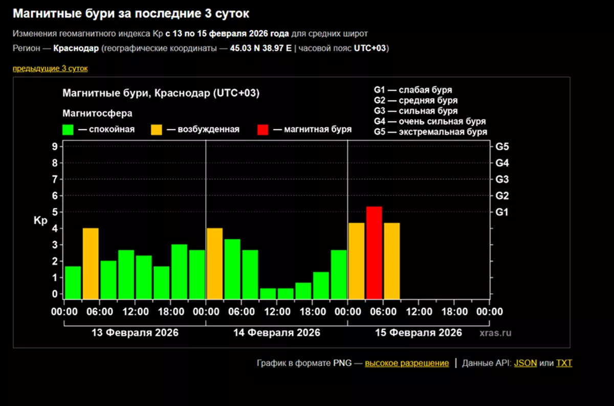 Магнитная буря уровня G1 накрыла Землю минувшей ночью. Она была непродолжительной, но может возобновиться. Геомагнитное поле нашей планеты находится в возбужденном состоянии – в «желтой» зоне. Об этом 15 февраля сообщается на сайте Лаборатории солнечной астрономии ИКИ и ИСЗФ РАН.