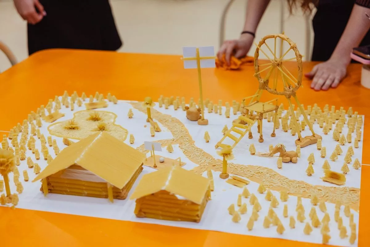 Школьникам предстояло проявить инженерные и конструкторские навыки, используя самые неожиданные материалы – обычные макароны разных форм и строительный пластилин. Задача участников – создать макет микрорайона, включающий в себя жилые дома, детский сад, школу, парк и другие объекты городской инфраструктуры.