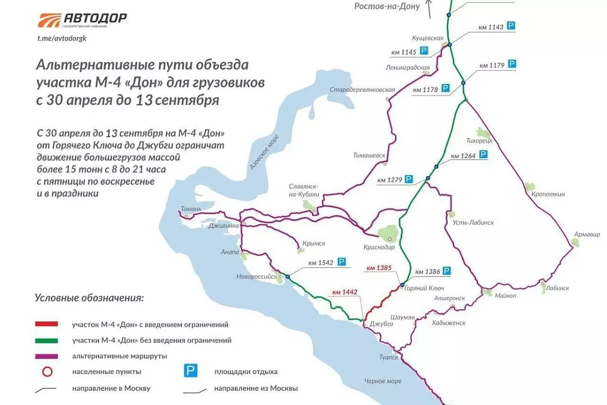 С 30 апреля по 13 сентября 2026 года на трассе «Дон», по которой с наступлением тепла автомобилисты устремляются к Черному морю, будет действовать ограничение проезда для грузовиков с разрешенной максимальной массой более 15 тонн. Оно вводится на участке от Горячего Ключа до Джубги с пятницы по воскресенье и в праздничные дни с 08.00 до 21.00. В будни и ночное время проезд не ограничен. Об этом 30 марта сообщила пресс-служба «Автодора», опубликовав карту с альтернативными путями объезда участка.
