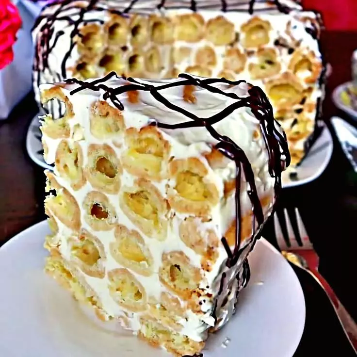 Крем (проще не бывает): Просто смешайте сметану + вареную сгущенку + ваниль. Никаких миксеров, просто ложкой до однородности. Чернослив нарежьте небольшими кусочками. Грецкие орехи порубите (не в крошку, а кусочками). Выкладываем торт прямо на блюдо: Каждый эклер окунаем в крем (полностью или обильно обмакиваем). Выкладываем первым слоем, слегка прижимая.