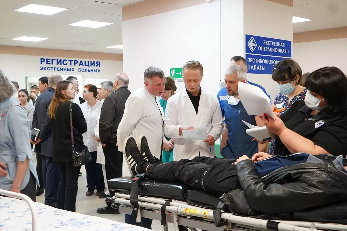 Тренировочное мероприятие в ККБ№1 организовали для совершенствования навыков оказания неотложной помощи в чрезвычайных условиях. Для отработки смоделировали сценарий массового поступления пациентов, подвергшихся воздействию различных типов травм, характерных для ЧС. Это политравмы, взрывные ранения и термические ожоги. После сигнала тревоги медперсонал с каталками и необходимым оборудованием оперативно прибыл в приемный покой больницы.