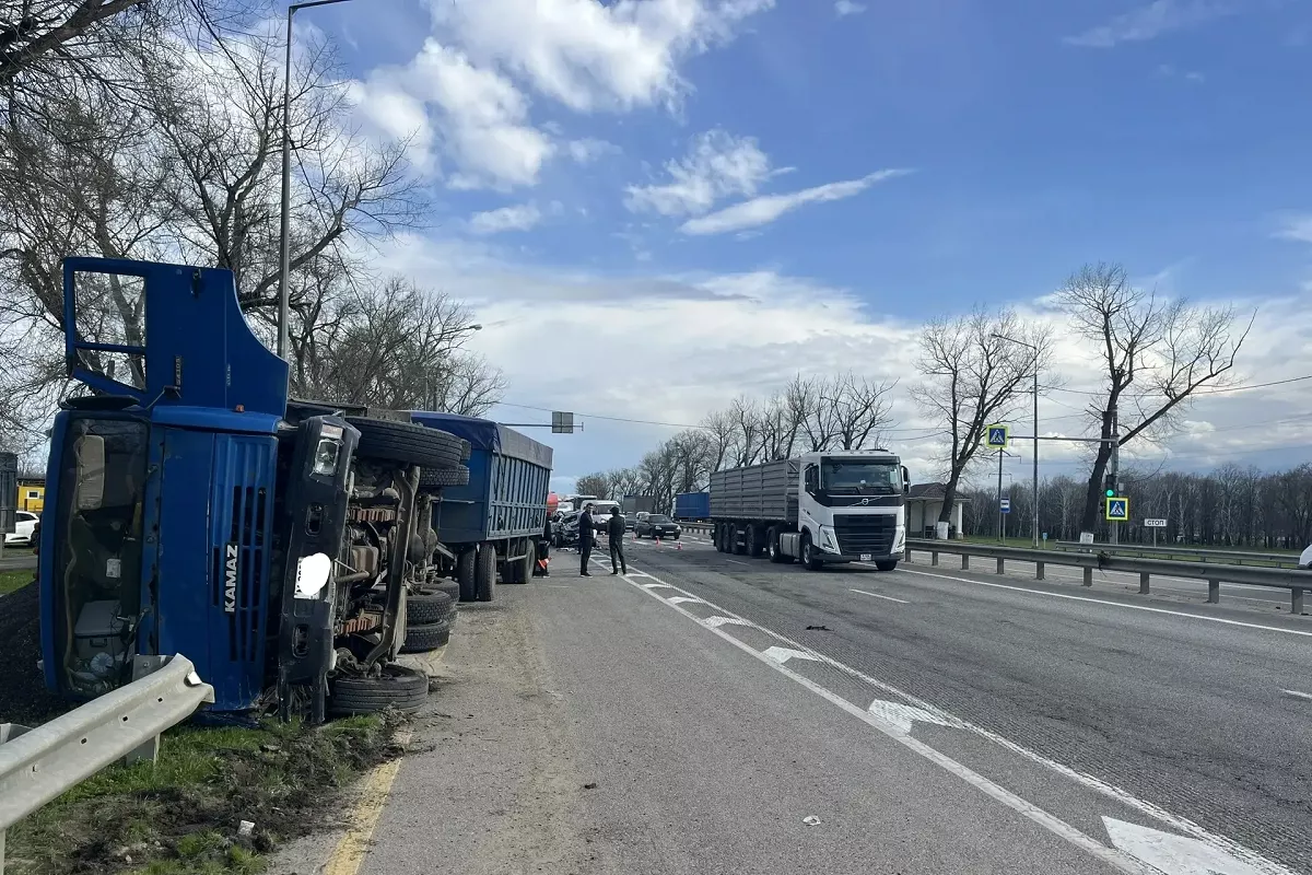 Сегодня днем в Армавире на федеральной автодороге «Кавказ» 59-летний водитель «КамАЗа» не выдержал безопасную дистанцию и наехал на стоящие на светофоре три легковых автомобиля: «Ладу Приору», «Киа» и «Мицубиси». От удара последняя иномарка столкнулась с «Солярисом» и транспортным средством КО-806. «КамАЗ» опрокинулся на бок.