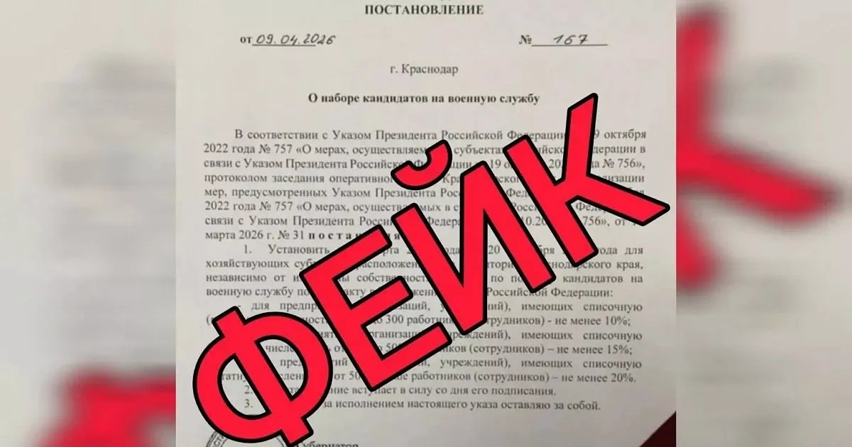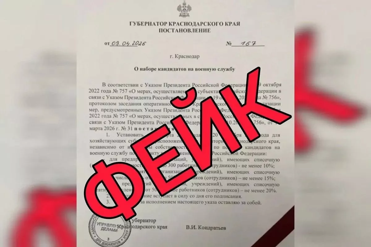 Администраторам каналов в социальных сетях рассылают фальшивое постановление губернатора, якобы для предприятий и организаций Краснодарского края в зависимости от численности сотрудников устанавливается задание по подбору кандидатов на военную службу по контракту. Также распространяют видеосюжет на данную тему, якобы снятый телеканалом «Кубань 24». Это все подделки. Об этом сообщает краевой Оперштаб.
