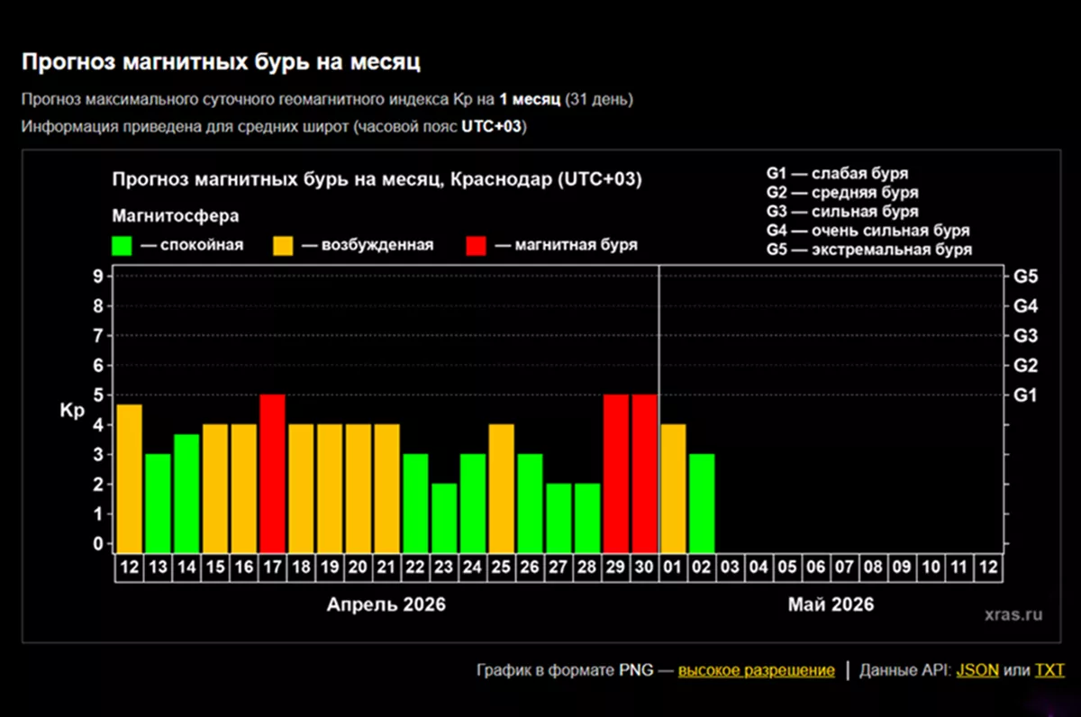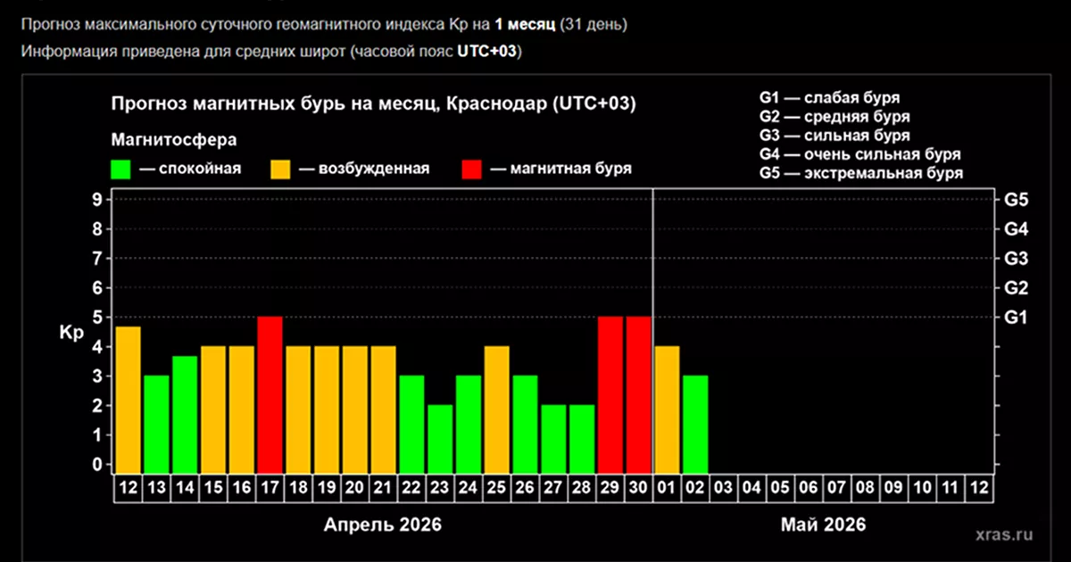 По данным на сайте Лаборатории солнечной астрономии ИКИ и ИСЗФ РАН, вероятность магнитных бурь велика 17, 29 и 30 апреля. С 15 по 21, а также 25 апреля геомагнитный фон будет повышен. Экстремальные удары по нашей планете в долгосрочном прогнозе не предвидятся – события не превысят уровня G1. Не исключены и внезапные магнитные бури.