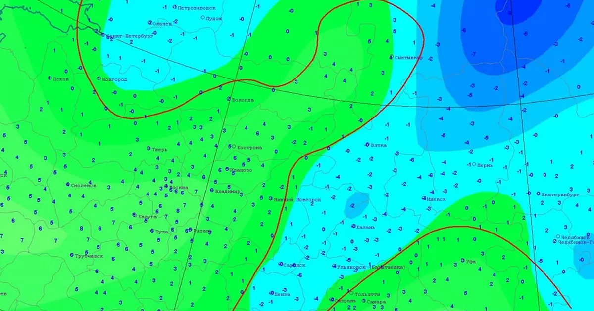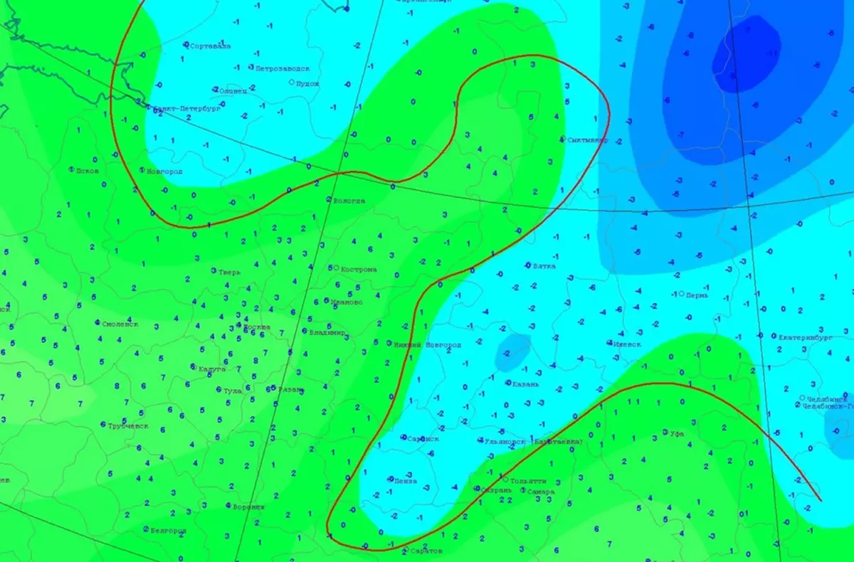 В ночь на 24 апреля нулевая изотерма пройдет через юг Коми и Поморья, центр Вологодской области, запад Костромской, Ивановской и Владимирской областей, центр Московской области, через Тульскую, Орловскую, Курскую и запад Белгородской области. В мешке слабоотрицательных температур окажется Русский Север, Северо-запад, запад Центральной России и Черноземья.