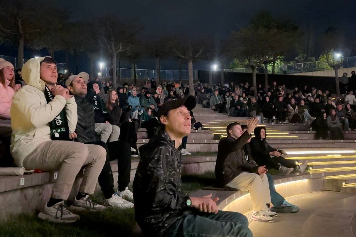 Знакомлюсь с Андреем и Ангелиной. Ребята приехали из Магнитогорска и специально сделали карту болельщика, чтобы попасть на стадион в воскресенье. А сегодня репетируют здесь. Они уверены, что «Краснодар» задавит темпом, и ставят на уверенную победу, со счетом 1:3. С ними приехала бабушка, Биямал Сарбаева, которая стойко переносит кубанский ветер и смотрит на экран с легким недоумением.