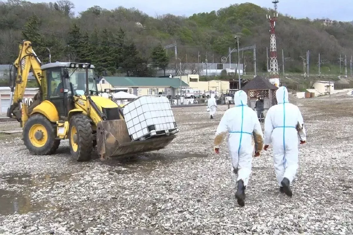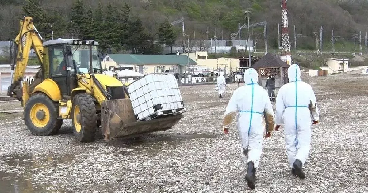 Загрязнение убирают ниже по течению реки, а также в акватории и на берегу Черного моря. К работам привлечено 120 человек, 20 единиц техники и 2 плавсредства и 4 нефтесборные установки.