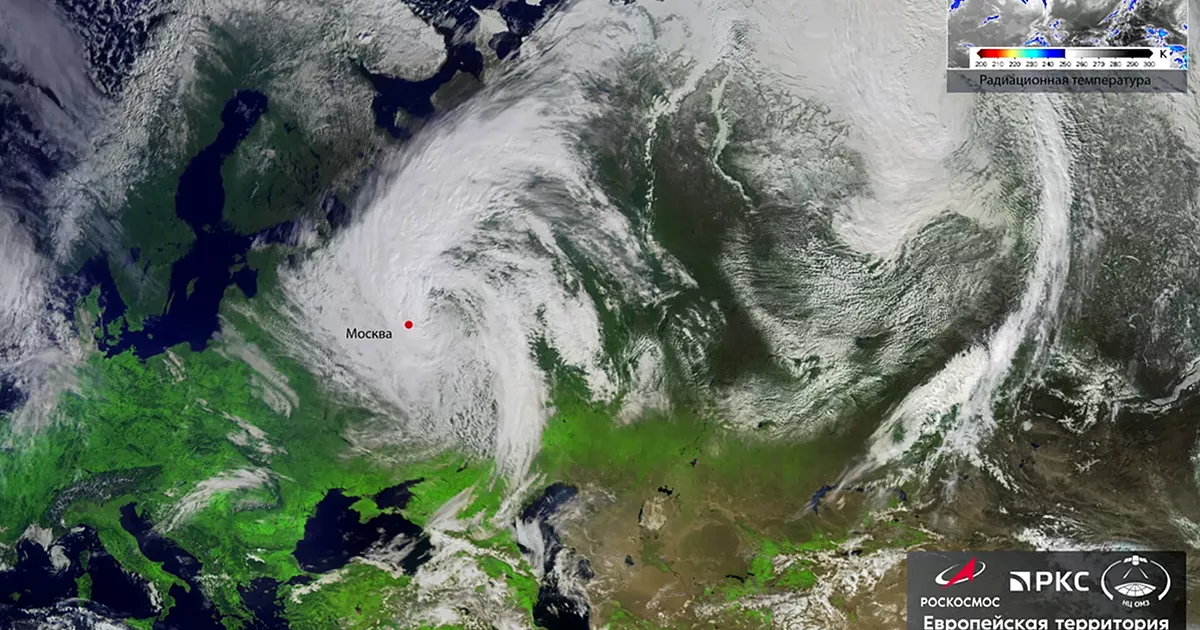 «Роскосмос» опубликовал спутниковый снимок снежного циклона, который 27 апреля испортил погоду в Москве и других центральных регионах. В столице только за ночь выпало более половины месячной нормы осадков.