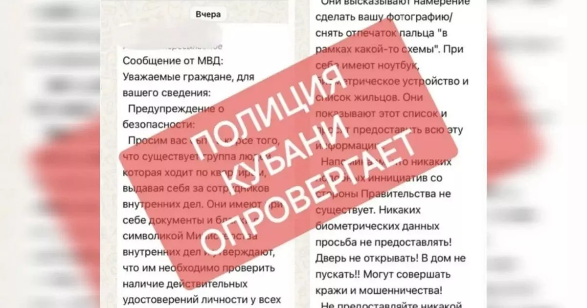В сети Интернет распространяется недостоверная информация о группе людей, которая ходит по квартирам и выдает себя за сотрудников органов внутренних дел. Эта информация не соответствует действительности. Об этом сообщили в пресс-службе ГУ МВД России по Краснодарскому краю.