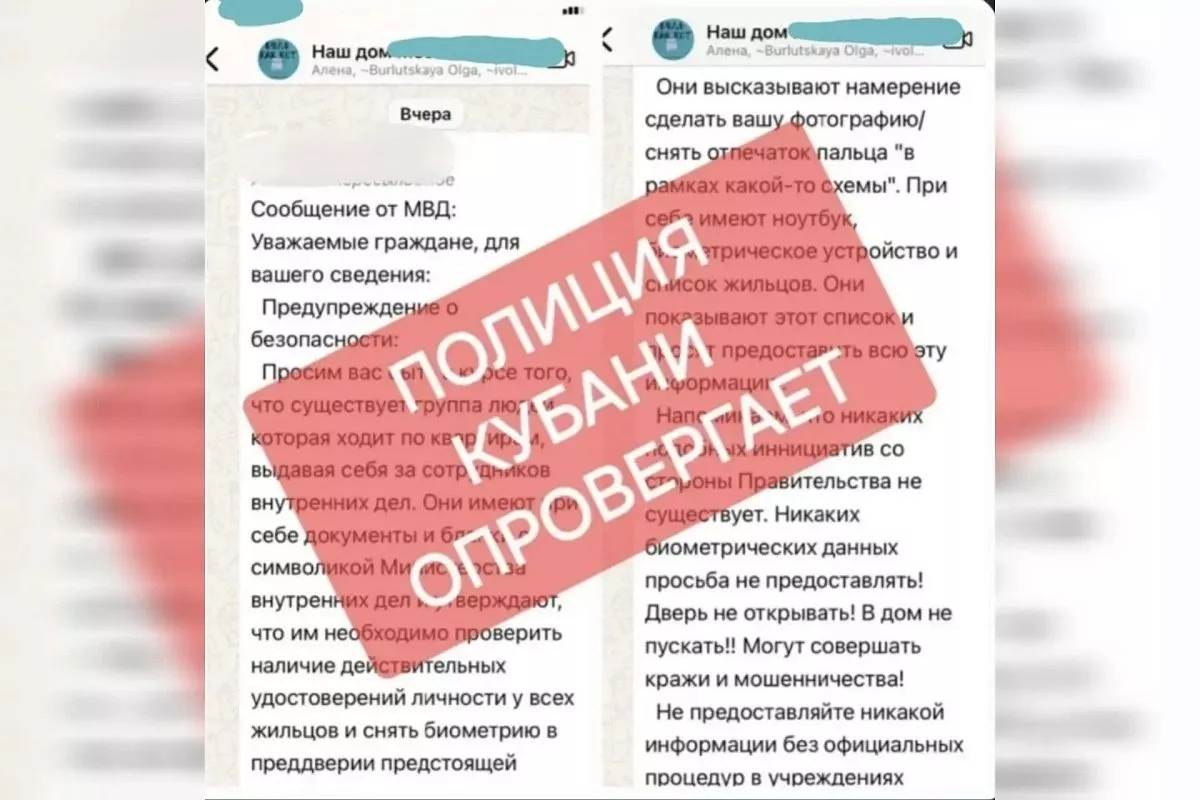 В групповых чатах распространяется недостоверная информация о группе людей, которые ходят по квартирам и выдают себя за полицейских.
