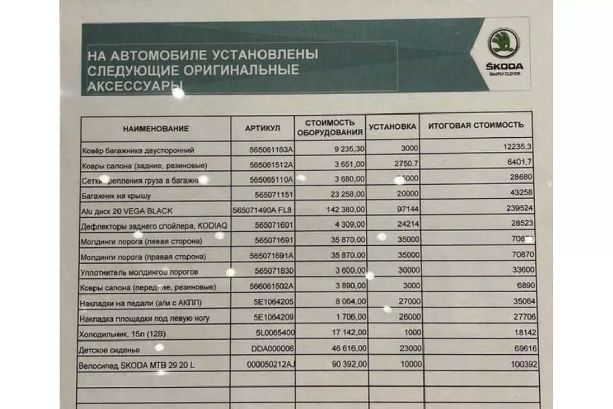 Из них 100 тысяч рублей — за горный велосипед Skoda MTB 29, вес которого составляет 13,9 кг. В число других самых дорогих «допов» входят диски за 240 тысяч рублей, молдинги порога за 71 тысяч рублей, детское сиденье за 70 тысяч рублей и багажник на крышу за 43 тысяч рублей.