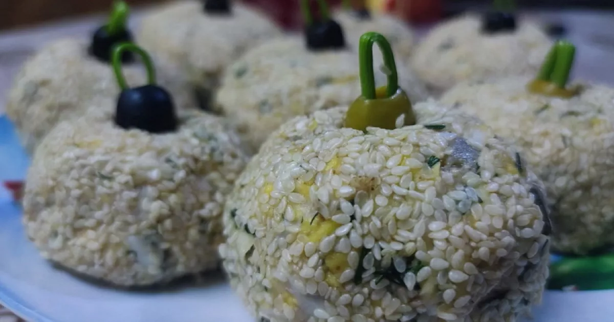 Далее надо скатать шарик и обвалять его в оставшейся части тертых крабовых палочек. Впрочем, тут возможны варианты. Можно заранее сделать обсыпку из тертого яичного белка, тертого желтка или даже давленого грецкого ореха. И таким образом мы получим «елочные шарики» разного цвета. Из стебля петрушки можно сделать на шарике петельку, за которую он должен подвешиваться на елку.