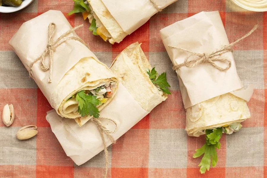 Разделите лаваш на 2 части. Одну из них с помощью кисти смажьте маринадом, сверху положите помидоры, нарезанные тонкими круглыми пластинками, в ряд на лаваш. Также кольцами надо нарезать лук и положить его на помидоры. Сверху – один кусочек филе.