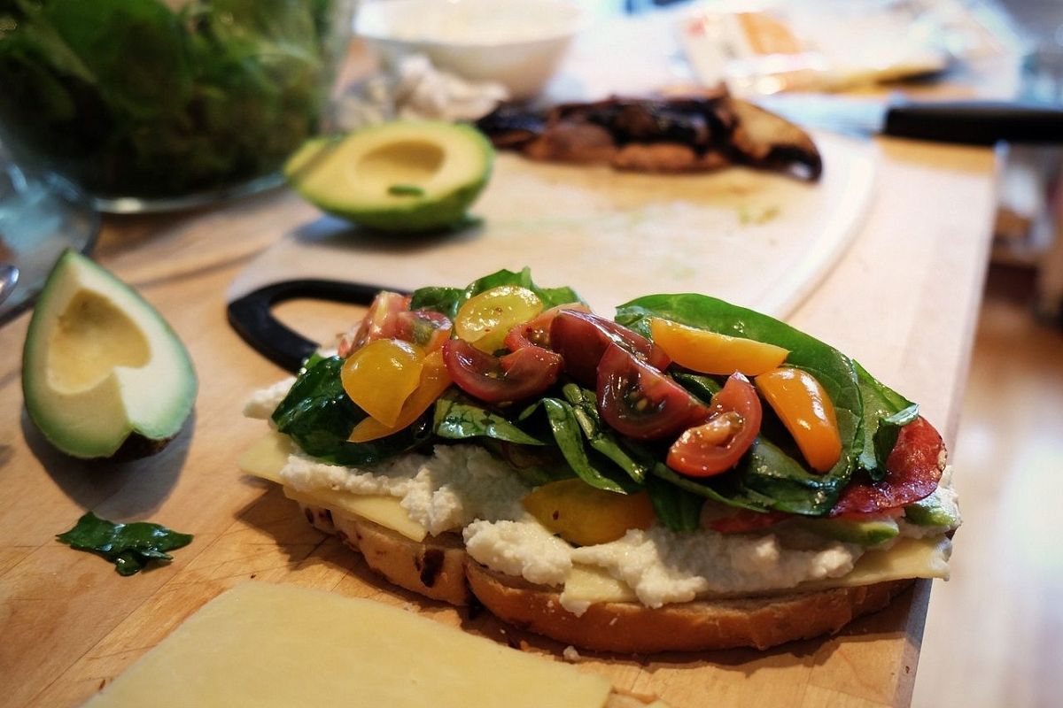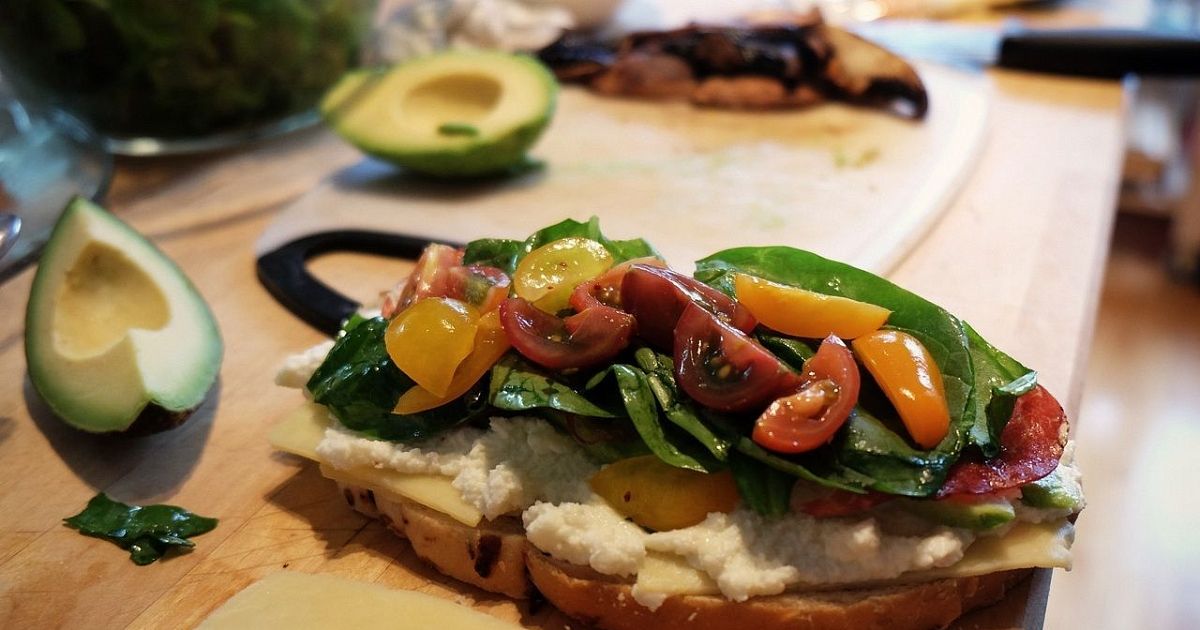 Чтобы брускетта была питательная и полезная, ее можно украсить не только овощами, но и кусочками мяса или морепродуктов.