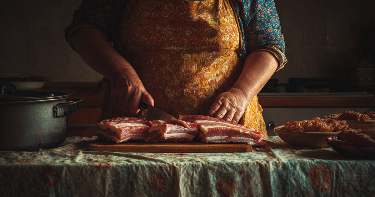 На кухне у моей дальней родственнице Тани — классика: 2 килограмма свежего свиного сала с прослойкой мяса, по-местному называемого «Adidas» (из-за полосок). Нарезает крупно, обваливает в смеси соли, паприки, чеснока, тимьяна и других пряностей, плотно укладывает в чистые банки. Никакой воды, никакого рассола.