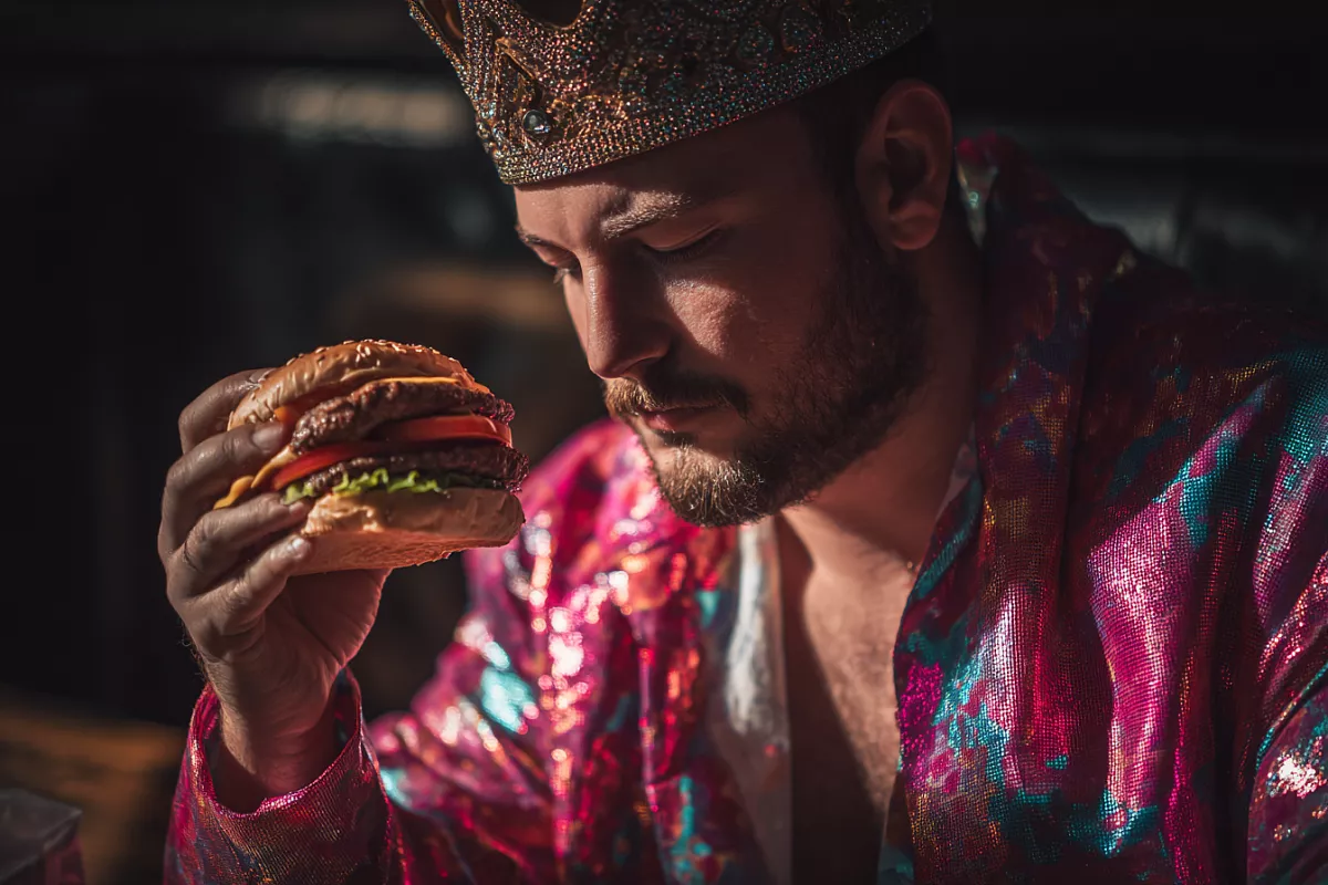 Константин Ивлев обещает эмоции «муре» — и слово держит. Его бургер не скатывается в фастфуд: это целый мясной спектакль, где каждая деталь — на своём месте. Никакой сухой котлеты и случайных ингредиентов. Только то, что работает на вкус.