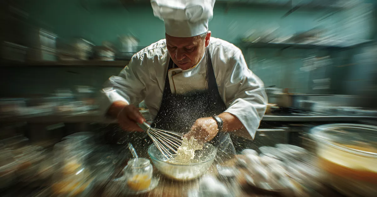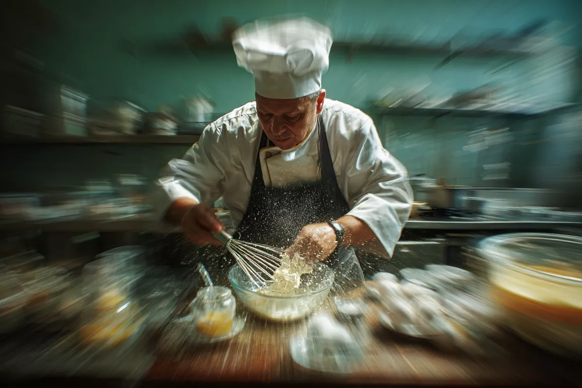 Параллельно шеф отделяет желтки (около 80 г) и смешивает их с сахаром — не взбивая, а аккуратно перемешивая, чтобы растворить сахар и не насытить смесь воздухом. Только после остывания сливок они соединяются с желтками. Это важно: горячая жидкость может свернуть яйца.