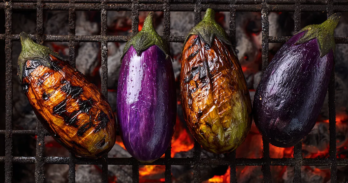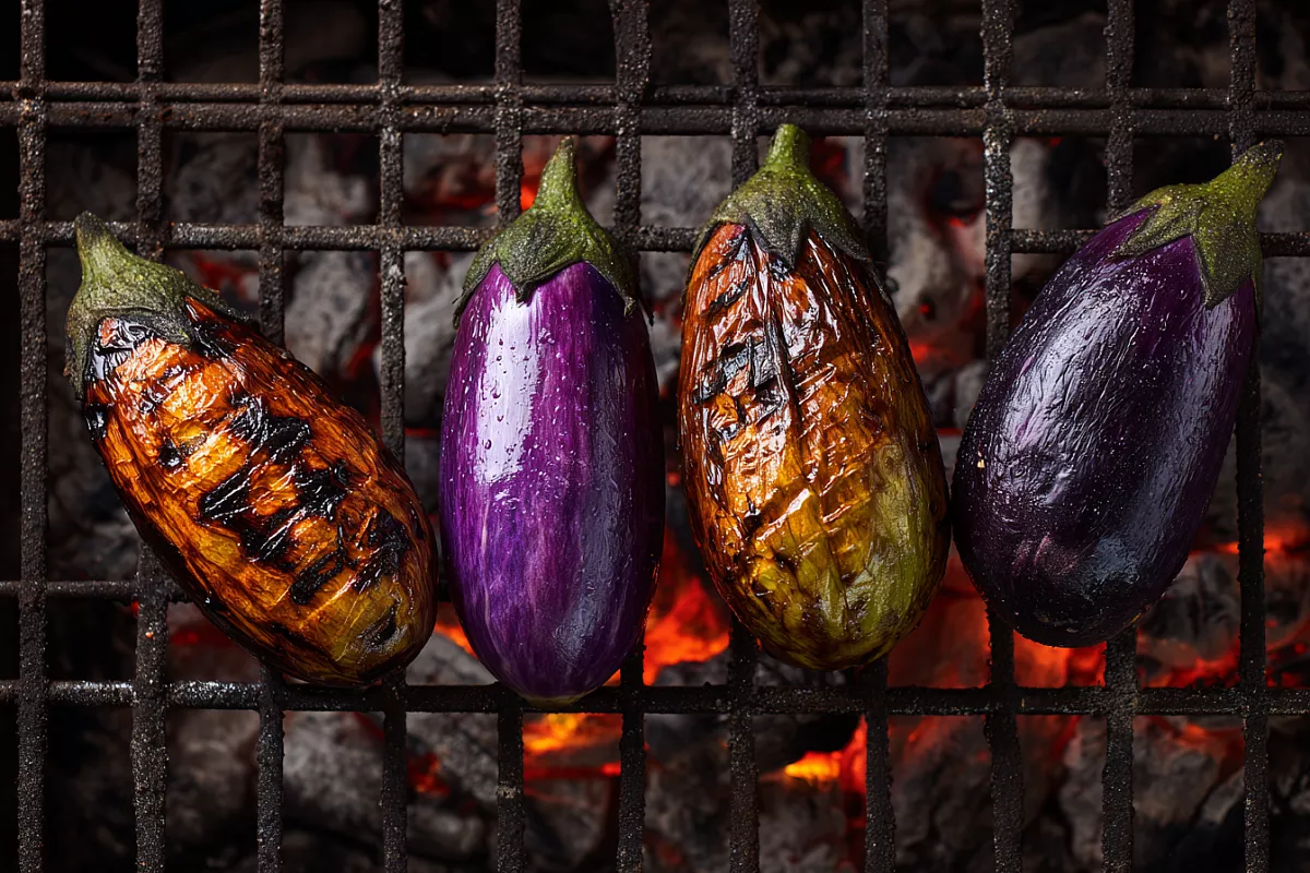 Вместо варки или обжарки баклажанов он начинает с запекания овощей на углях. Баклажаны и немного болгарского перца обугливаются до черноты, чтобы легко снять кожицу. Сделать это можно на гриле или мангале, надев на шампуры. Горячие овощи складывают в миску, накрывают крышкой и дают остыть, чтобы кожица легко отходила.