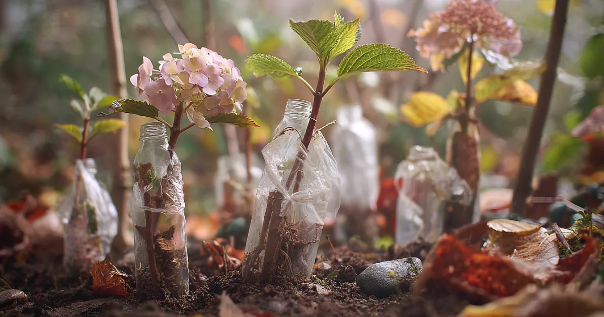 Для укоренения понадобятся пятилитровые пластиковые бутылки с крышками и спанбонд. Черенки высаживают в рыхлую, влажную почву в притенённом месте, например, в цветнике или на грядке, где нет прямого солнца. Солнечные участки вызывают перегрев и конденсат, что вредит укоренению. Черенки втыкают в землю наискосок, заглубляя нижнюю почку, на расстоянии 5–7 см друг от друга. На 2–3 черенка ставят одну бутылку, вдавливая её в почву так, чтобы листья не касались стенок. До наступления устойчивых заморозков (–5…–6 °C) бутылки оставляют закрытыми. Когда заморозки станут постоянными, крышки снимают, а бутылки накрывают двойным слоем спанбонда, фиксируя его камнями или кирпичами, чтобы защитить черенки зимой.