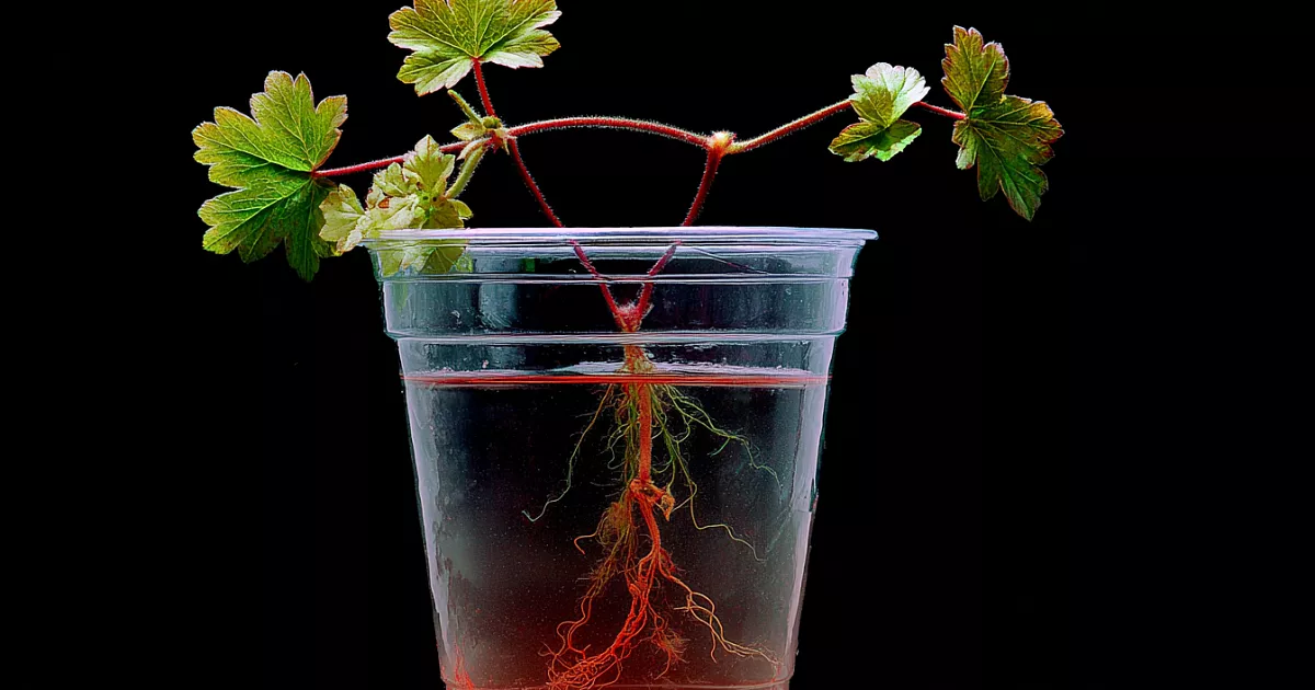 Свежий зеленый срез, чистый стеклянный стакан и яркий свет — с этого начинается быстрый корнеобразующий «стартап» для герани.