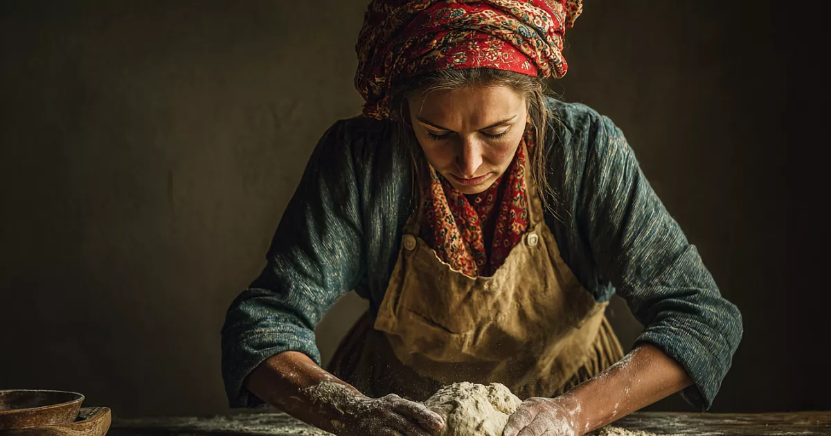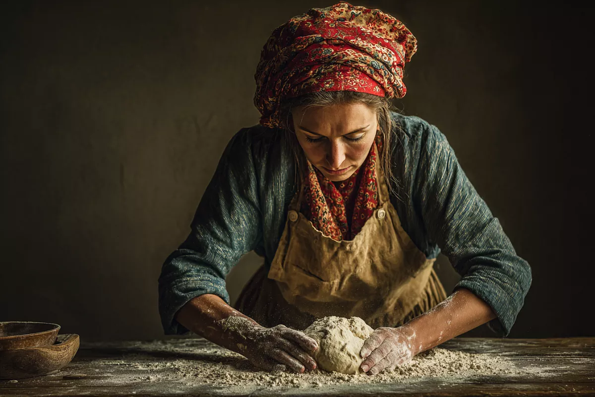 Когда тесто увеличилось в объёме, его делят на три части по 320 г. Начинку раскладывают на три порции по 390 г. Баланс здесь принципиален: в осетинском пироге начинка должна быть тяжелее или хотя бы равна по весу тесту. Лепёшки формируют на подпылённой мукой поверхности, собирают края в центре, а затем раскатывают в тонкий круг. В середине обязательно делают отверстие, чтобы пар выходил и корж не вздулся.