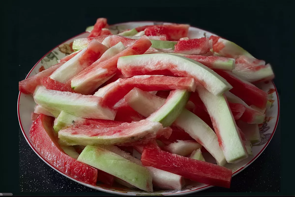 Для приготовления понадобится 1 кг арбузных корок и 1 кг сахара. Мякоть удаляют, а плотные белые корки нарезают произвольно — в процессе варки их объём уменьшится примерно втрое. Корки тщательно пересыпают сахаром и оставляют на полчаса: этого времени достаточно, чтобы они пустили сок.