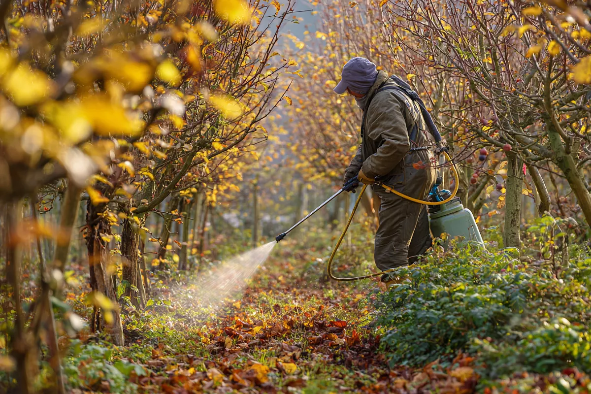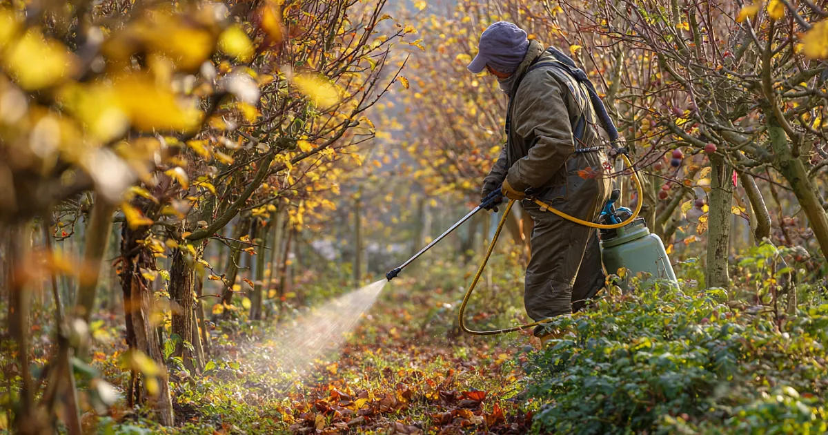Обработку проводят в начале листопада, тщательно смачивая листья, стволы и почву под деревьями. Это ускоряет разложение опавшей листвы и плодов. Для высоких деревьев используют опрыскиватели с телескопическими штангами длиной до 2–3 метров, чтобы обработать всю крону. Особенно важно обработать груши, так как ржавчина, вызываемая грибком, активно распространяется через споры.