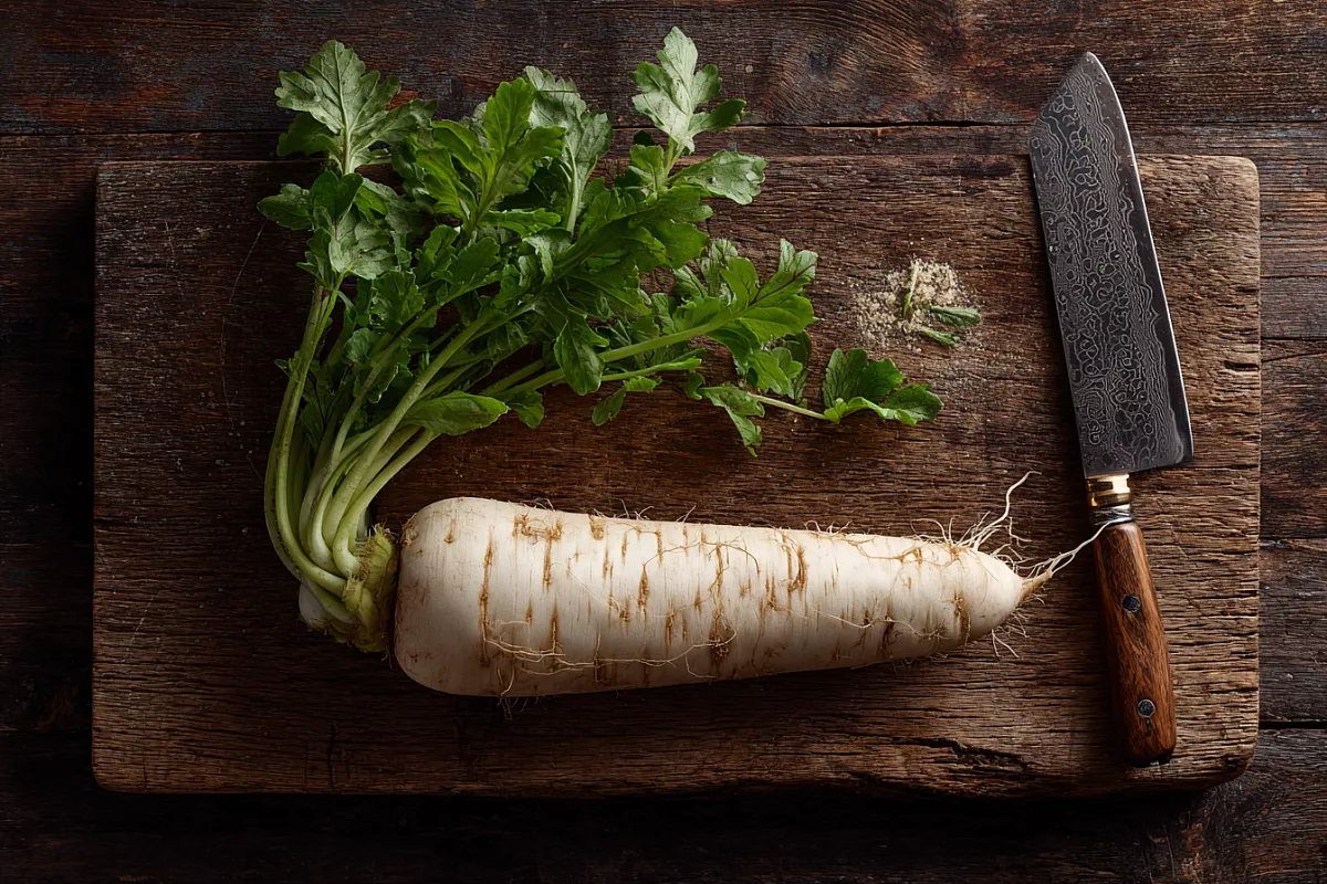 Дайкон — длинная белая редька из Японии. По вкусу он мягче чёрной редьки: сочный, хрустящий, со слабой остротой и лёгкой сладостью. Сырой хорош в салатах и роллах, при тушении и запекании становится нежным. Для покупки ориентируйтесь на плотный, тяжёлый корнеплод без трещин; храните в холодильнике в пакете 1–2 недели. Если попалась горчинка, очищенный дайкон на 10–15 минут замачивают в холодной воде — вкус станет мягче.