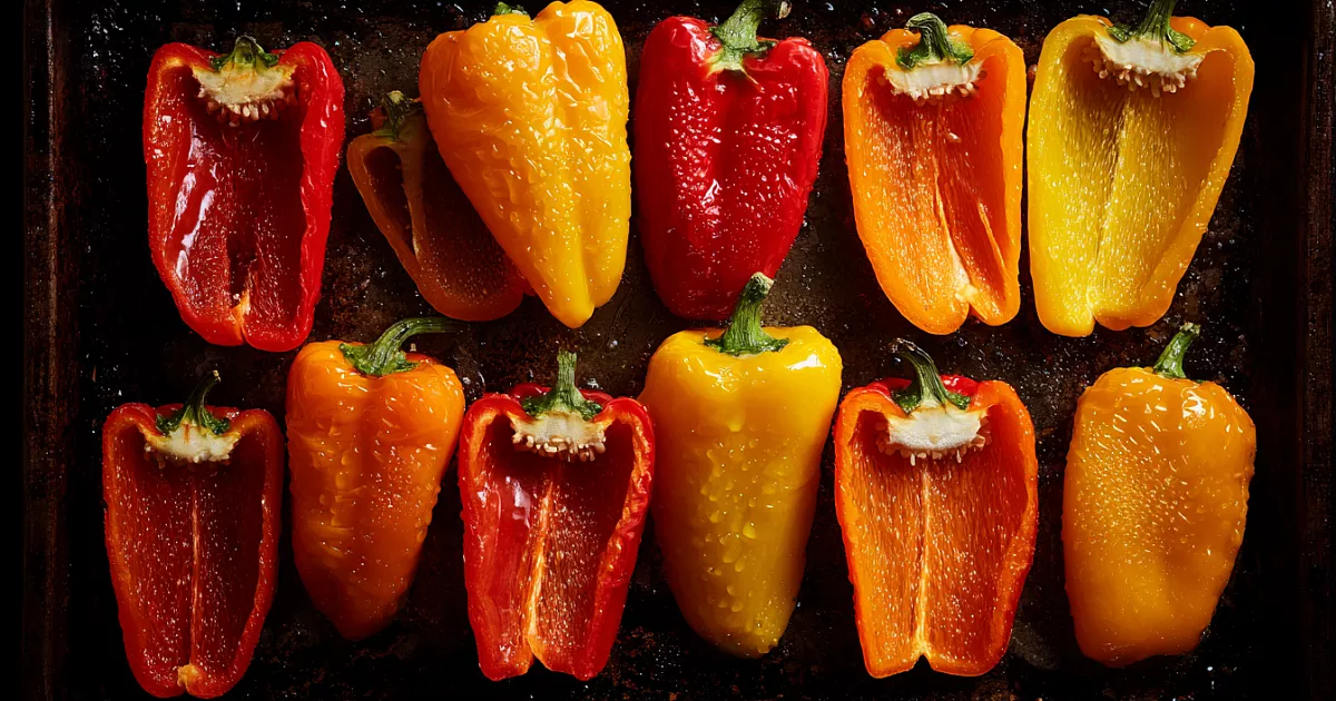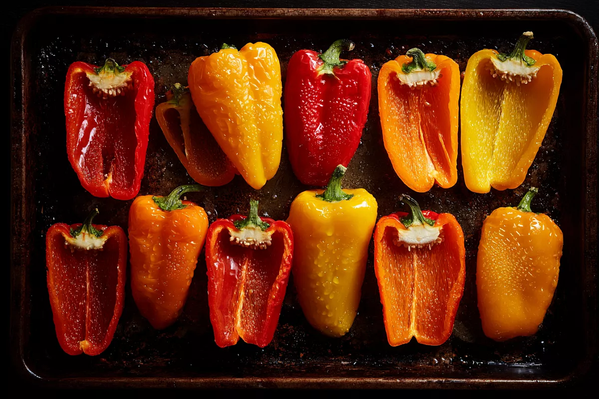 Пока банки стерилизуются, перцы подготавливают: удаляют семена, белые перегородки и плодоножки. Затем выкладывают на противень, сбрызгивают маслом, присыпают щепоткой соли и отправляют в духовку на 30 минут при 200 °C. После запекания овощи накрывают фольгой и оставляют в выключенной духовке на 10–15 минут — это упрощает очистку и делает мякоть более нежной.